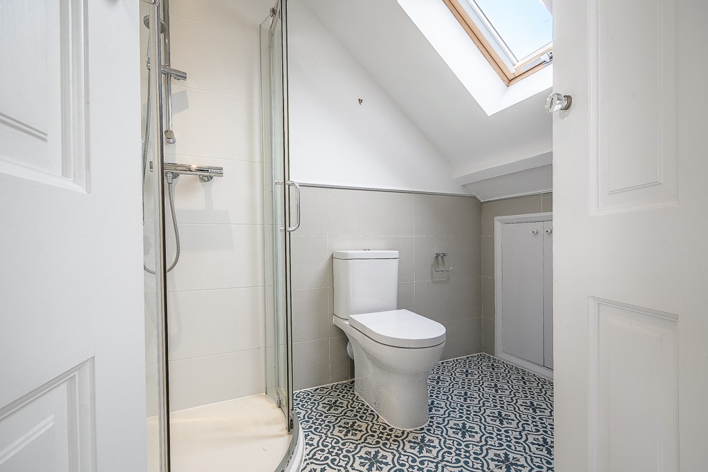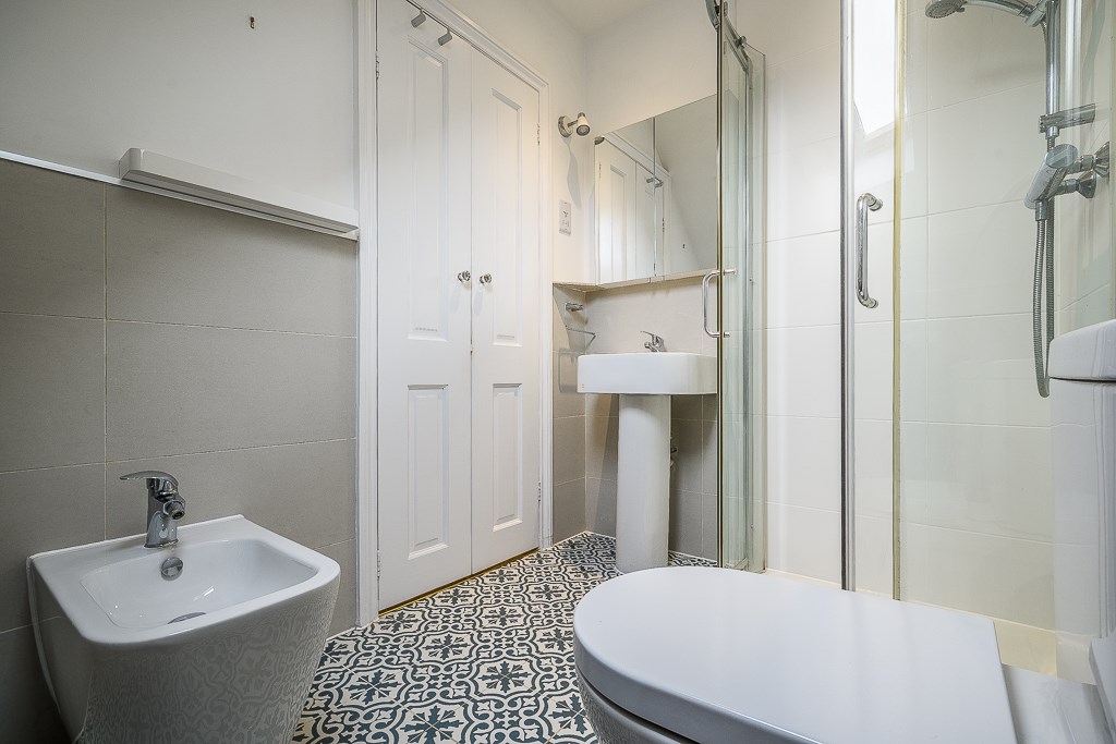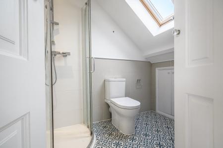 En-suite Shower Room: A contemporary white suite comprising curved shower cubicle, low-level WC, pedestal wash hand basin with mixer tap and bidet with mixer tap. Mirror fronted medicine cabinet. Attractive tiled floor throughout. Velux window. Eaves storage. Underfloor heating.