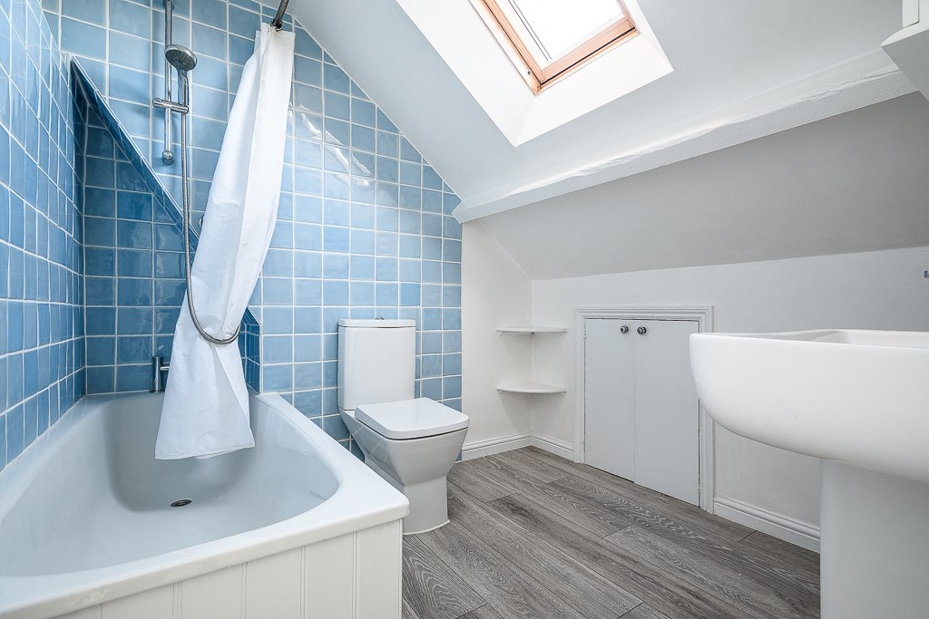 Bathroom: A contemporary white suite comprising bath with mixer tap and shower over complete with shower rail and curtain. Pedestal wash hand basin with mixer tap and low-level WC. Eaves storage. Wood effect floor. Underfloor heating.