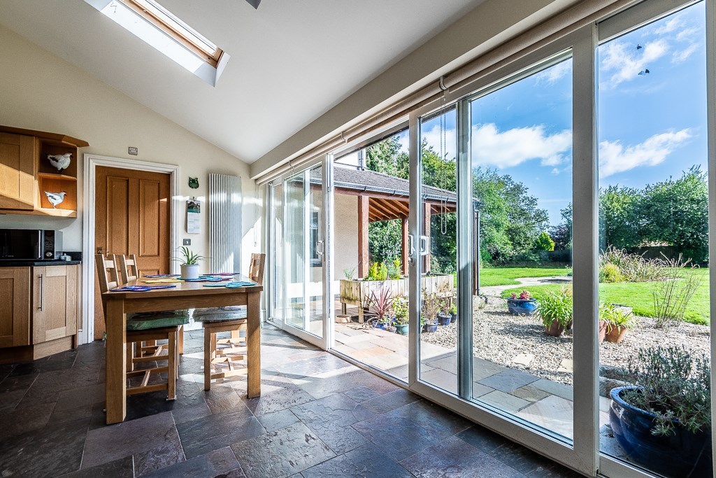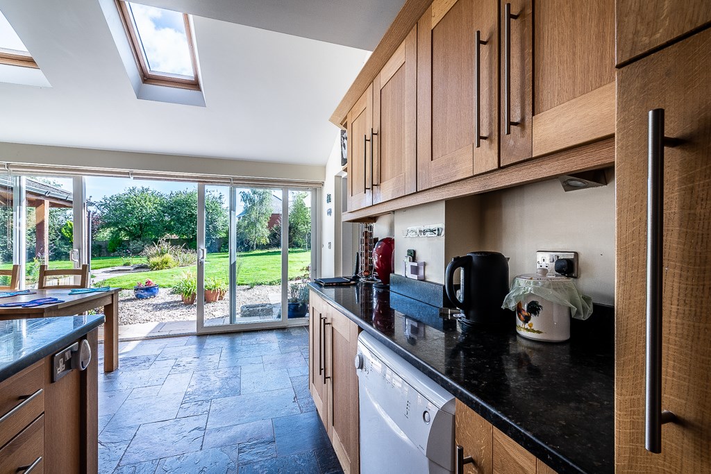 UTILITY ROOM: 2.57m x 2.06m (8'5" x 6'9") Slate floor; oak fronted units; stainless steel sink and draining board; worktop surfaces; spotlighting; space for a washing machine and tumble dryer; radiator; double glazed door out to the rear garden; (with lapsed planning for an extension).