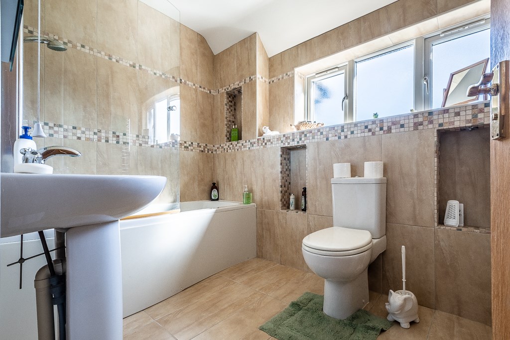 BATHROOM/WC: A very pleasant fully tiled bathroom; obscure double glazed windows to the rear elevation; bath with shower over; low level WC with push button flush; wash hand basin with mirror over with integrated light; chrome heated towel rail; spotlighting; shaver point.