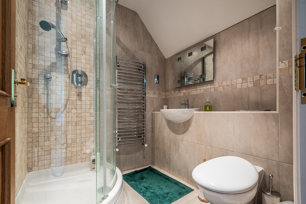 ENSUITE SHOWER ROOM/WC: Fully tiled with a corner shower unit with shower; WC with push button flush; wash hand basin with mirror and light over; heated towel rail; spotlighting; and shaver point.