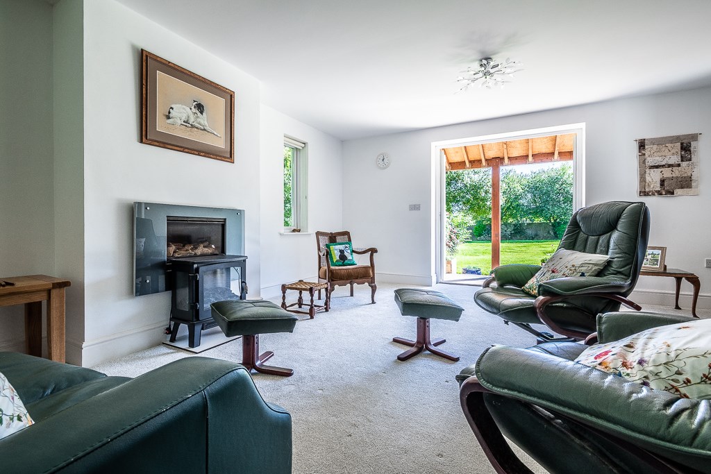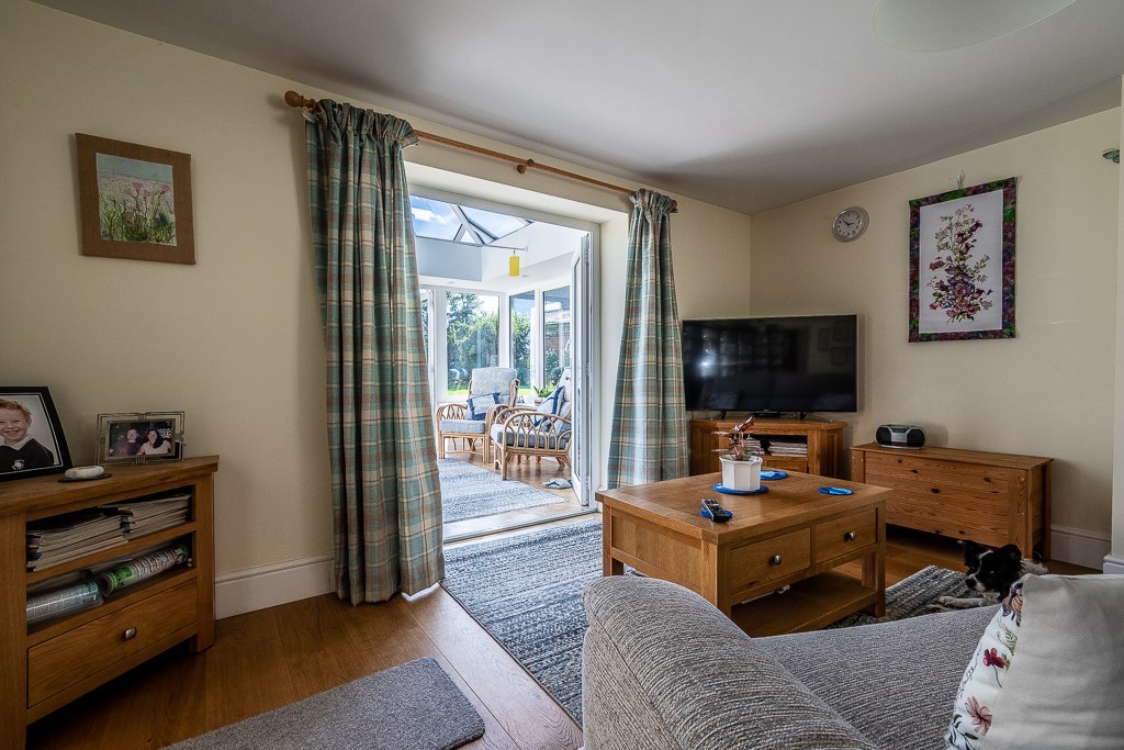 SITTING ROOM: 5.84m x 4.83m (19'2" x 15'10") An excellent sized room with glazed double doors opening onto the garden; two double glazed windows to side elevation; living flame gas fire (not currently being used); recess wall mounted radiator; television point; telephone point.