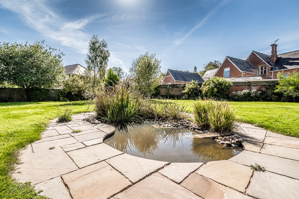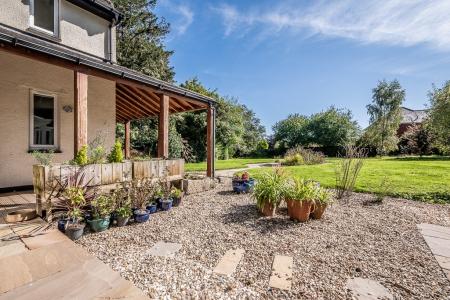 OUTSIDE: An impressive approach with double wooden gates leads to a large gravelled PARKING AND TURNING AREA with a DETACHED DOUBLE GARAGE; lawn front garden with shrubs.To the rear of the garage is the storage room/workshop. The rear garden is a real feature and generous in size mainly laid to lawn; pond; mature shrubs and trees; covered verandah with lighting, outside tap (attached to garage) and outside power socket; generous size potting shed (another outside tap attached); vegetable patch; further breeze block tractor shed.