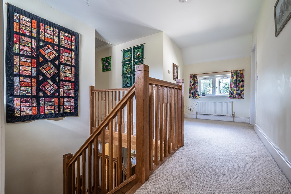 GALLERIED LANDING: Oak ballustrades; double glazed windows to the front and rear elevation; radiator; hatch to roof space via loft ladder also housing modern gas boiler; large airing cupboard with water cylinder and shelving.
