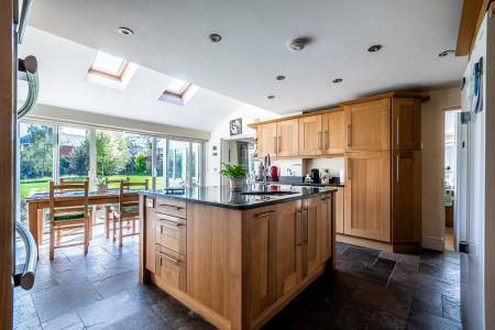 KITCHEN/BREAKFAST ROOM: 6.1m x 4.57m (20'0" x 15'0") Situated in the heart of the house, the kitchen is an excellent size fitted with a range of oak fronted units; granite worktop surfaces; a large central island with a one and a half bowl stainless steel sink unit; NEFF oven and separate grill; five ring gas hob; plenty of storage cupboards and American style fridge/freezer; plumbing for dishwasher; spotlighting; television point; slate flooring with underfloor heating; wall mounted upright radiator; fantastic wall of windows which slide open leading out to the rear garden plus two velux windows.