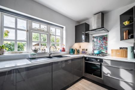 Large window overlooking the side garden, worktop surface with composite sink and drainer with mixer tap, range of cupboards and drawers under, 5 ring gas hob with electric oven under and stainless steel extractor over, matching range of eye level cupboards, integrated fridge/freezer, integrated dishwasher, integrated washer/dryer, large corner larder style cupboard, tiled floor.