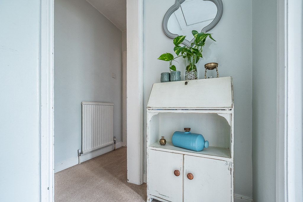 Lovely bright room with double glazed window overlooking the front, log burner, door to understairs cupboard.