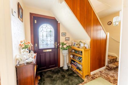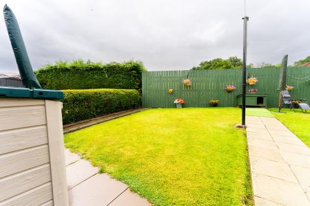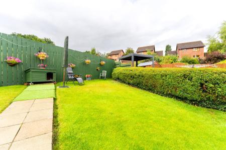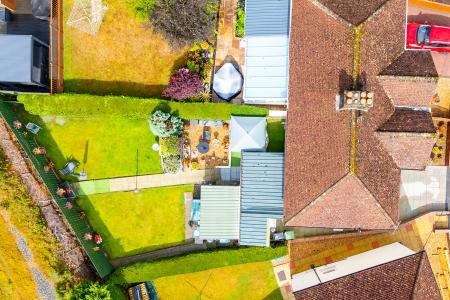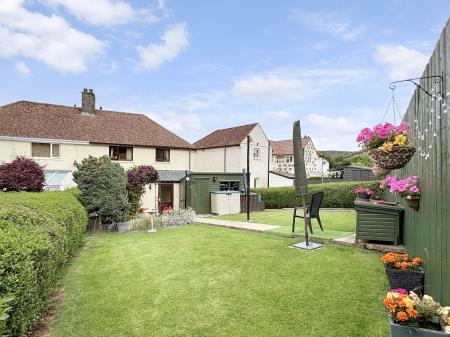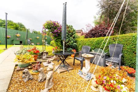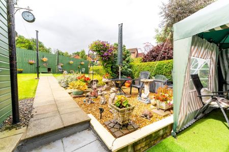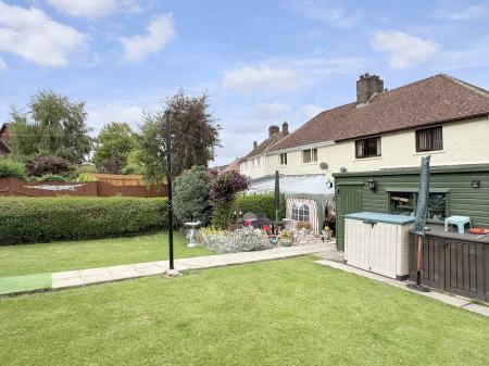 - Large, south-westerly facing rear garden with lawn, gravelled areas, paved BBQ patio, and a 3.44m x 2.30m timber garden store