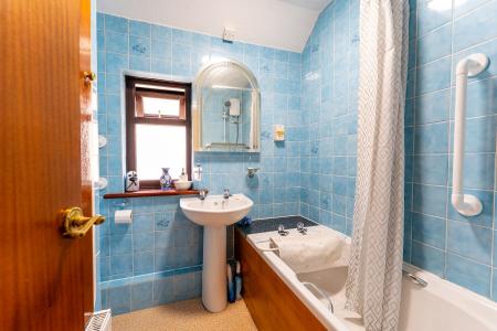 - Modern family bathroom with panelled bath, low flush WC, and pedestal wash hand basin