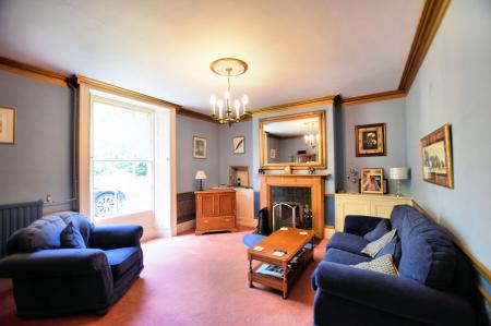 SITTING ROOM 17' 1" x 14' 7" (5.21m x 4.44m) The "blue room" offers delightful views over what was the tennis lawn and provides a fantastic formal area to host guests away from the other family areas of the home. With the original period ceiling high sash windows complete with shutters and large fireplace the room really has a grand feel to it, enhanced by the decorative coving and lower level panelling.