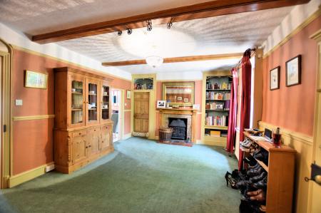 ENTRANCE HALL 16' x 12' 2" (4.88m x 3.71m) The entrance hall or additional reception room enjoys a Georgian sash window to the front aspect overlooking the front gardens. The centre piece of the room is the large cast iron log burner with brick and wood surround. With fitted carpet flooring and original period doors the room is bursting with character. Access to the right storage wing.
