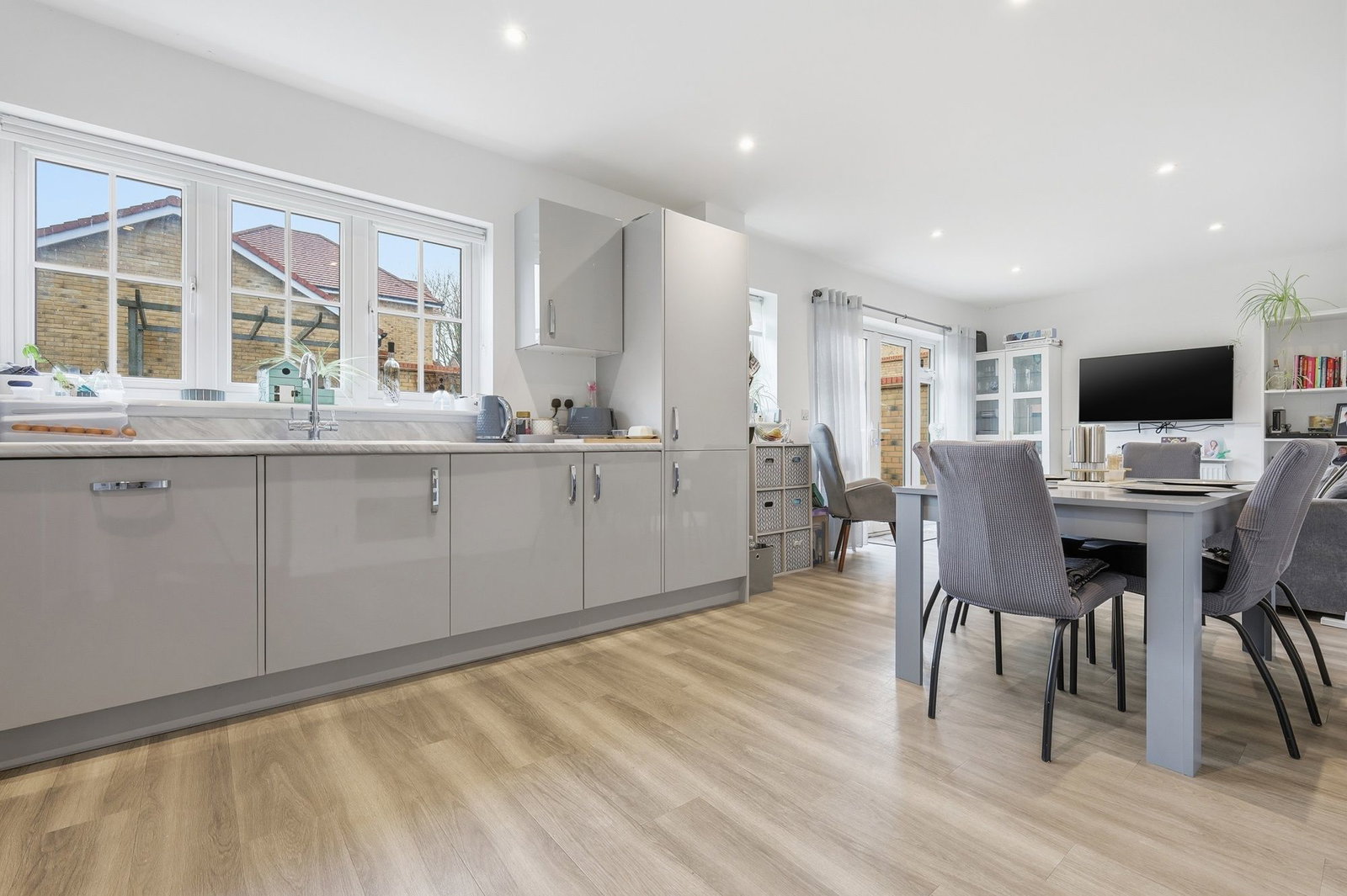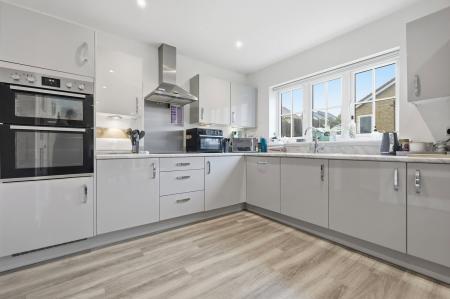 White laminate worktops incorporating stainless steel 1 1/2 bowl sink with chrome tap. Stainless steel extractor hood, integrated double oven, ceramic hob with stainless steel splashback and integrated fridge freezer. uPVC double-glazed windows to rear. uPVC doors opening to rear garden. Door to: