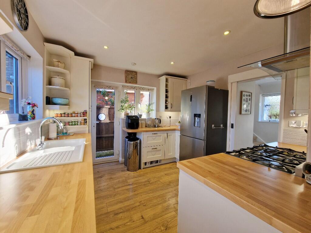 Kitchen:- - 3.23m x 2.97m (10'7 x 9'9) - Double glazed window to rear, double glazed door to side leading to rear garden. Range of wall and base units with various storage solutions including a pull out larder, complimented with solid wood work surfaces, space for range cooker and fridge freezer, integrated dishwasher. Wall mounted radiator. Breakfast bar leading through to living room. Cupboard housing boiler.