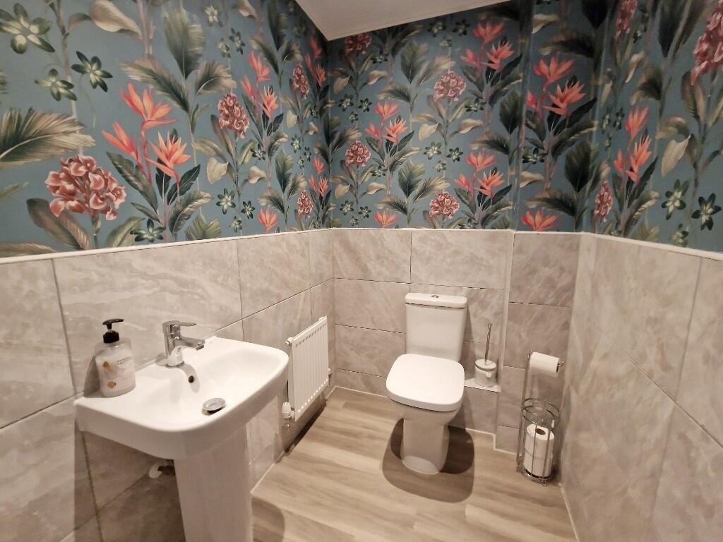 Cloakroom:- - Close coupled wc with push button flush, hand wash basin, chrome effect heated towel rail.