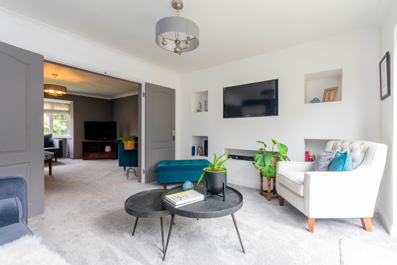 4.00m x 3.40m (13' 1" x 11' 2") having coved ceiling, radiator, ceiling light point, UPVC double glazed double doors with UPVC double glazed side panels out to the garden and feature media wall with recess for T.V. and sound bar along with decorative recesses for personal effects.
