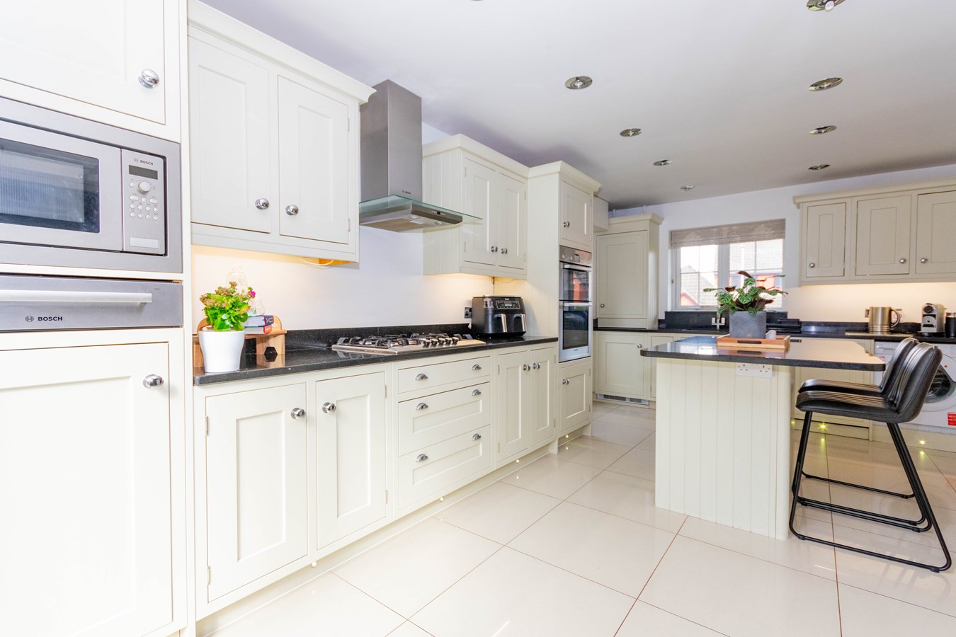 5.50m x 3.20m (18' 1" x 10' 6") having a continuation of the ceramic tiled flooring with underfloor heating, recessed downlights, wooden Shaker style units comprising base cupboards and drawers with granite work tops above, matching wall mounted cupboards with under-cupboard lighting, feature central island with power points, extra cupboard storage and wine fridge, integrated five burner hob with overhead extractor, integrated eye-level double oven and grill, inset one and a half bowl sink and drainer with mono mixer tap, built-in microwave, space and plumbing for American style fridge/freezer, integrated washer/dryer and integrated dishwasher, corner cupboard housing the Worcester boiler, UPVC double glazed window to front, UPVC opaque double glazed door to side and UPVC double glazed double doors out to the rear patio garden.