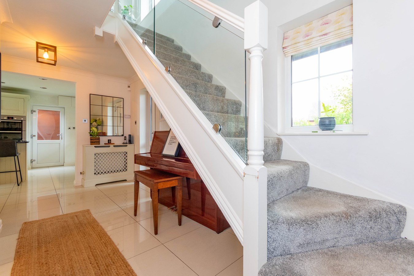 this fabulous space has a modern open plan feeling with an opening into the breakfast kitchen, doors to further accommodation, ceramic tiled flooring with underfloor heating, two ceiling light points, stairs with glazed balustrade to first floor with storage space beneath, radiator with decorative cover and UPVC double glazed window to front.