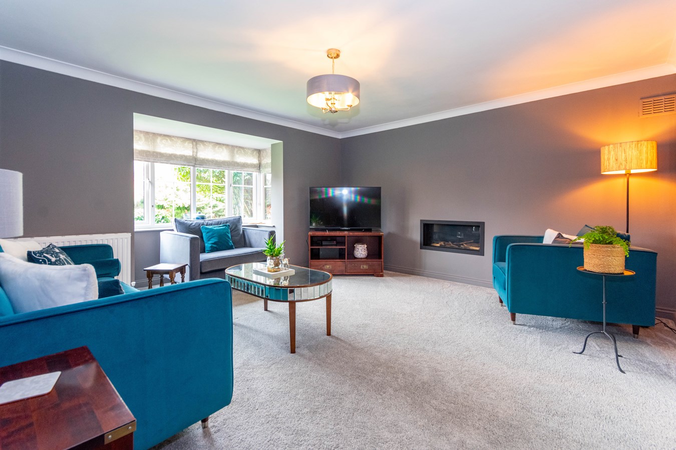 4.90m max into bay x 4.50m (16' 1" max into x 14' 9") having coved ceiling, ceiling light point, feature walk-in UPVC double glazed bay window , radiator, modern floating gas real flame fire and double doors opening to the sitting room.