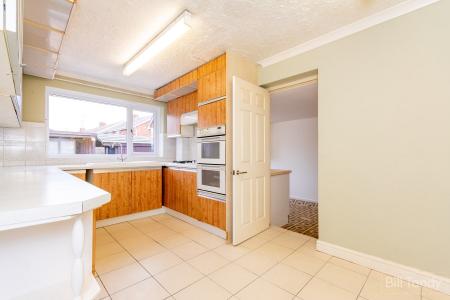 4.20m x 2.60m (13' 9" x 8' 6") having pre-formed work surface with wood effect base cupboards below, matching wall mounted cupboards, one and a half bowl ceramic sink and drainer with mono mixer tap, tiled splashbacks, gas hob with extractor above, integrated eye-level double oven, space and plumbing for dishwasher, UPVC double glazed window overlooking the rear garden, two fluorescent strip lights and door to the utility room.