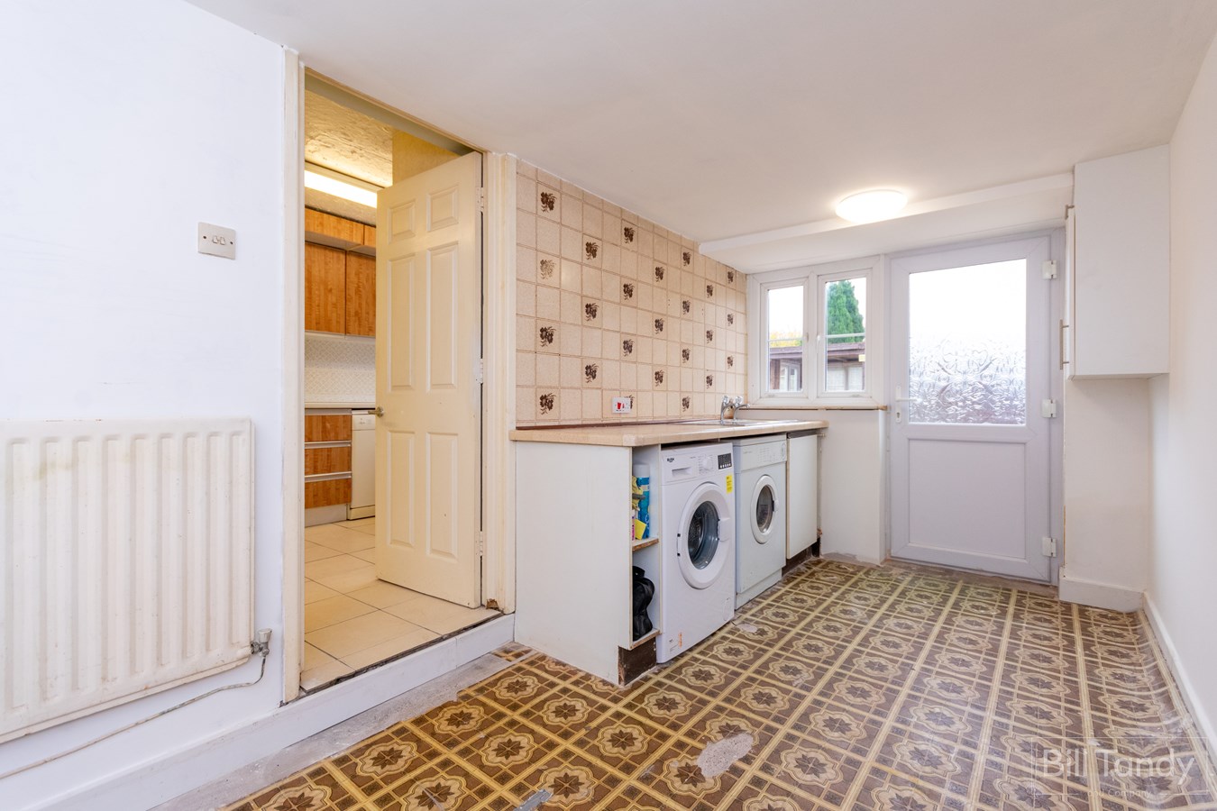 4.80m x 2.10m (15' 9" x 6' 11") having tiled work surface and splashback, corner cupboard housing the condensing boiler, inset sink and drainer, space for washing machine and tumble dryer, two ceiling light points, UPVC opaque double glazed door to the rear garden, UPVC double glazed window to side, radiator and door to garage.