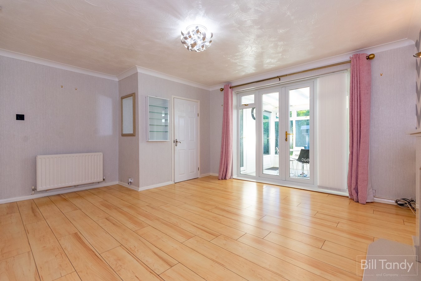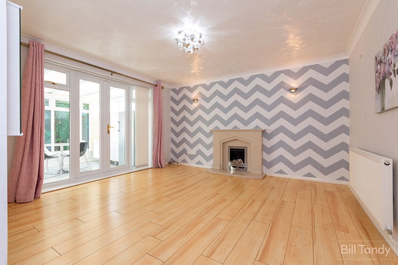4.80m max x 4.20m (15' 9" max x 13' 9") a delightful space having modern wood effect flooring, focal point feature fireplace having marble mantel and hearth housing a gas real flame white pebble effect fire, ceiling light point, two wall light points, two radiators and UPVC double glazed French doors out to the rear conservatory with UPVC double glazed side panels.