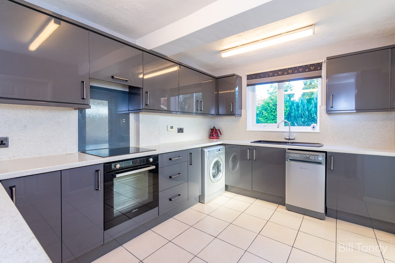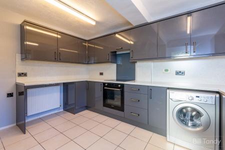 3.80m x 2.80m (12' 6" x 9' 2") having modern grey high gloss base units with contrasting complementary roll top work surface above, matching splashback panelling, matching wall mounted units, integrated sink and drainer with mono mixer tap, induction hob with overhead extractor and oven below, space and plumbing for slimline dishwasher and washing machine, two ceiling light points, UPVC double glazed window overlooking the rear garden, radiator and UPVC opaque double glazed door to the conservatory.