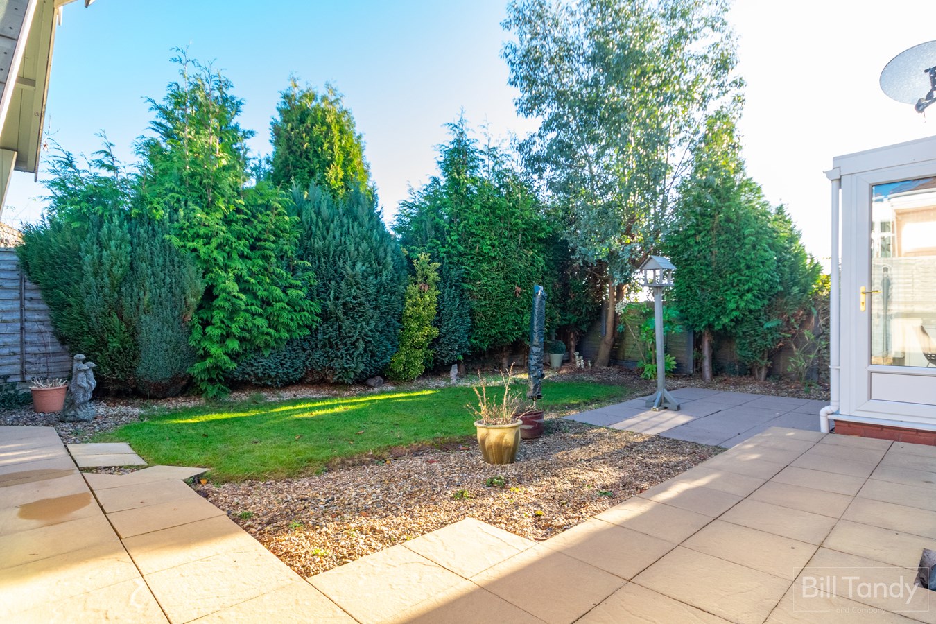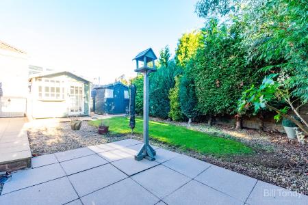 The property is set well back from the road behind a sweeping block paved driveway with a pebbled area for additional parking if needed. There is a lawned area with mature bedding plant border, an iron gate opens to larger than average side access with paved path leading to the rear garden. To the rear is a lovely paved patio seating area, and a paved path leads to a summerhouse with power supply and phone line, and a garden shed. The garden itself is mainly laid to lawn with pebbled area for potted plants and fir tree and fenced boundaries.