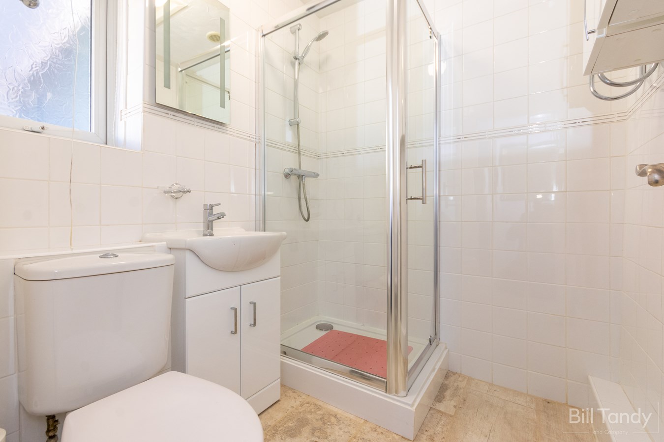 1.90m x 1.60m (6' 3" x 5' 3") having contemporary tiled flooring, tiling to walls, wall mounted cupboard, loft access hatch and white suite comprising low level W.C., wall mounted wash hand basin with high gloss storage cupboard below and corner shower unit with glazed entrance door and mains plumbed shower fitment.