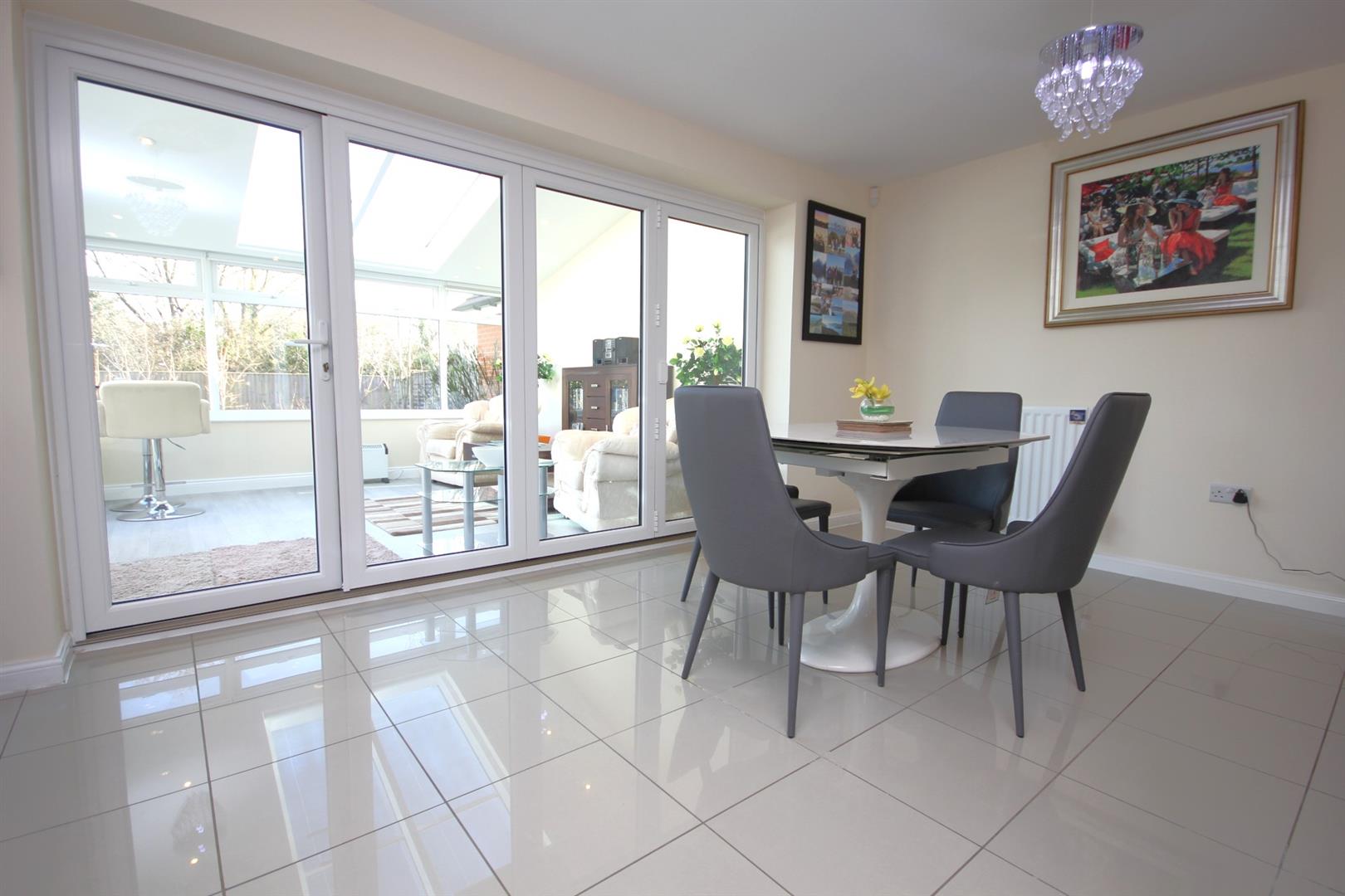 Impressive sun room enjoying bi-folding doors opening out onto the garden, two skylight windows both with motorised built in blinds