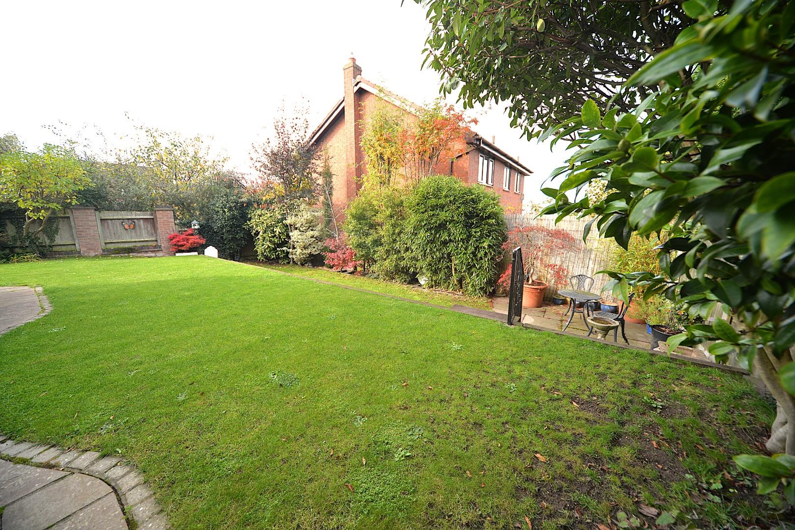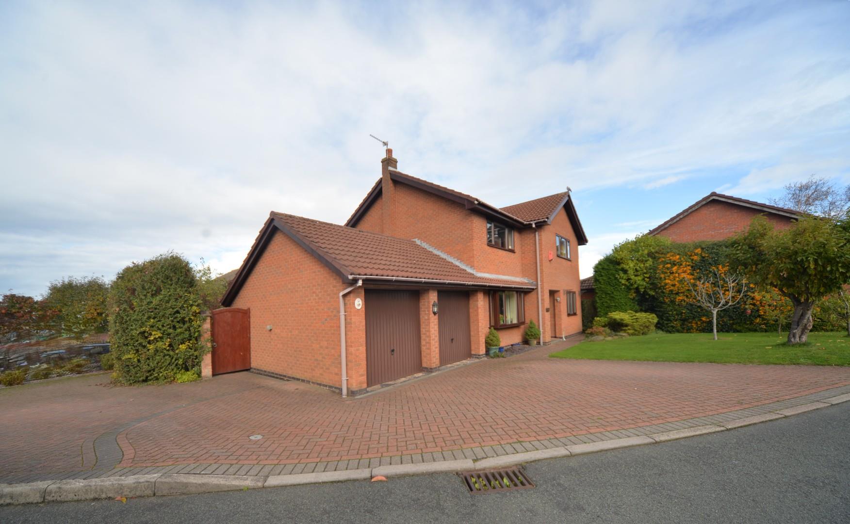 The property sits on a superb corner plot with an attractive front lawn with large herbaceous borders and a selection of trees including fruit trees, there is a large block paved driveway providing ample parking and leading to the garage. A path leads down the side of the property and opens up into the rear garden which has a paved patio area with lawn and three steps leading down to a lower lawn area with a further patio area. There are large mature shrub borders and views over the surrounding town and hills beyond.