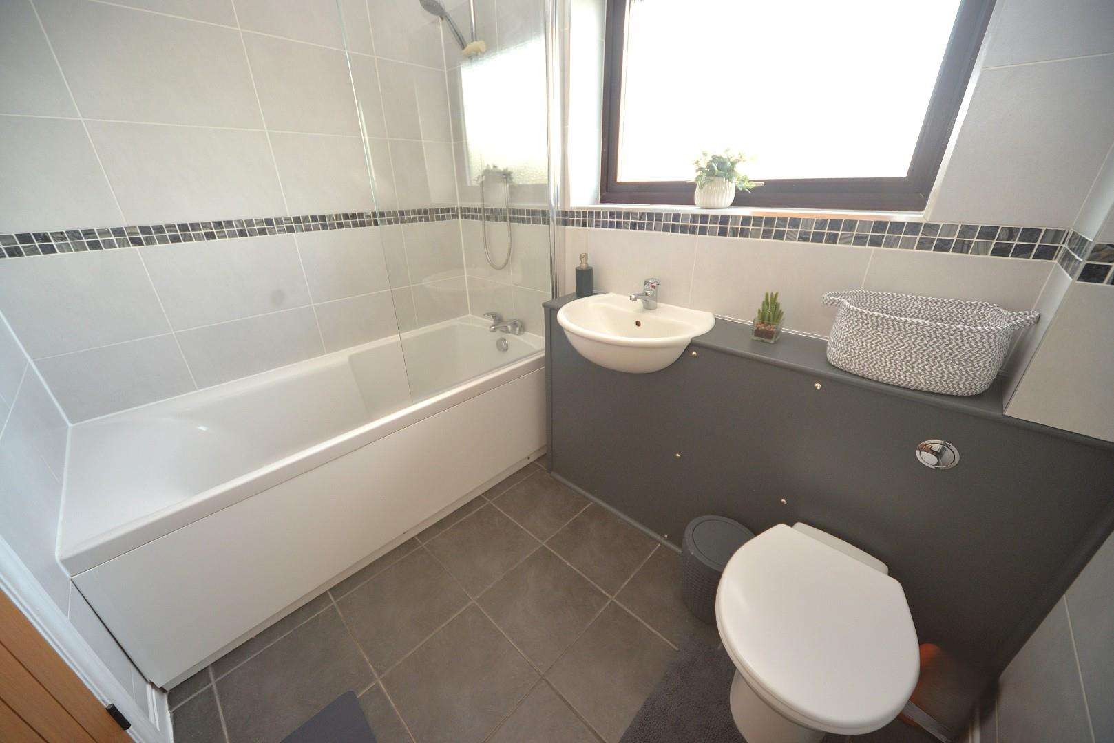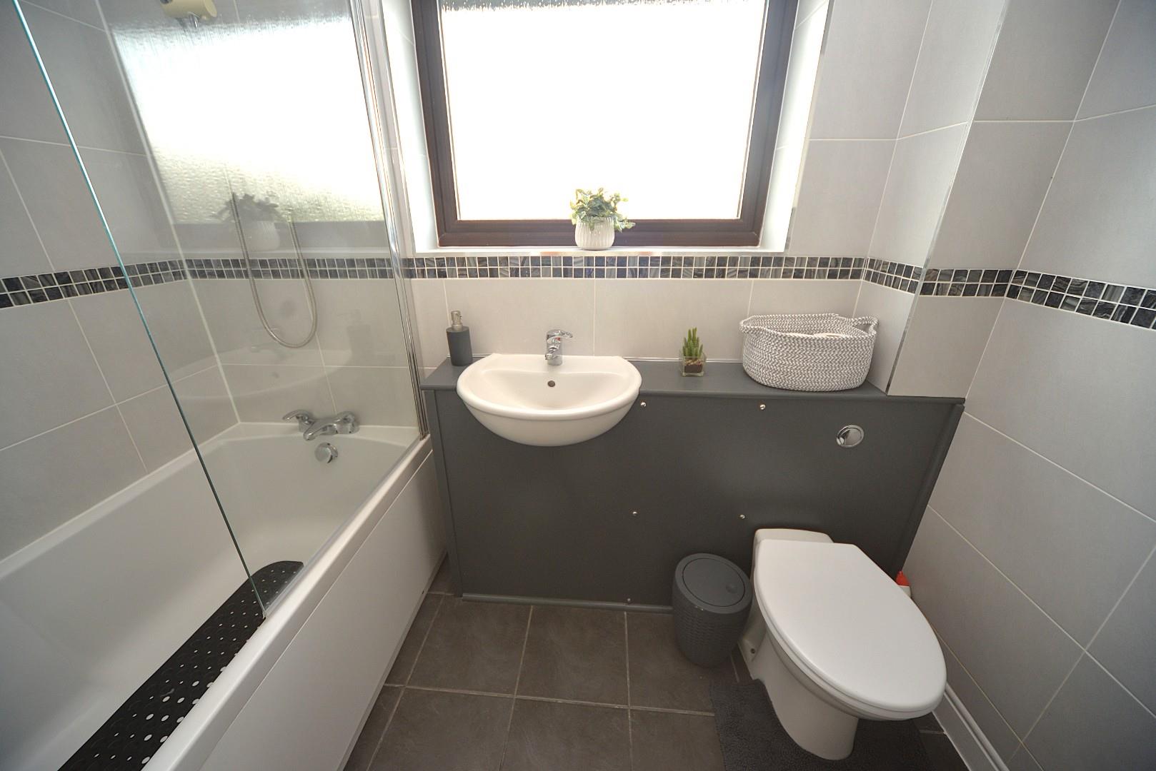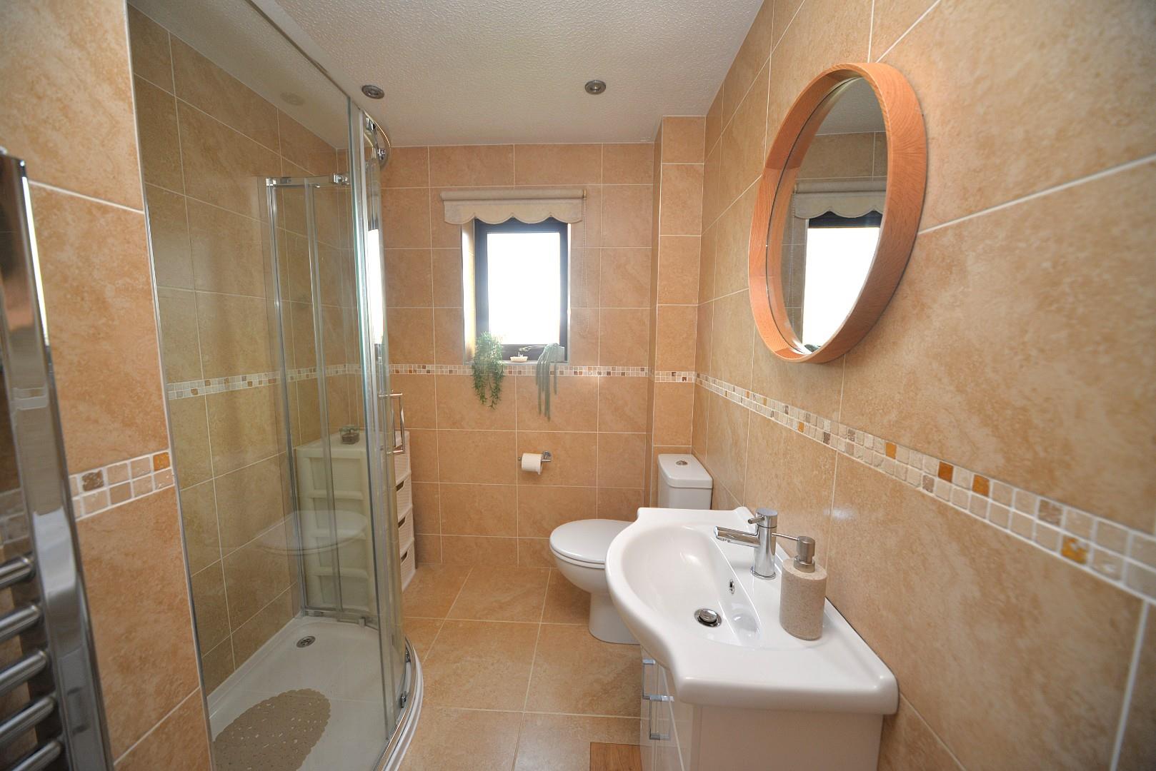 2.35m x 1.67m to window (7'8" x 5'5" to window ) - Is attractively fitted with a panelled bath with mixer taps and separate power shower that runs off the hot water system with glazed screen, built in W.C. and hand wash basin, there is a window to the rear aspect, recessed ceiling down lights, chrome heated towel rail and attractive tiled flooring and walls.