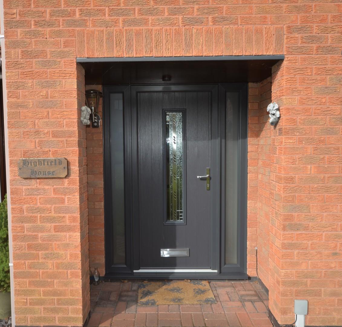 Contemporary style entrance door with two glazed side panels open into a light and airy hallway.