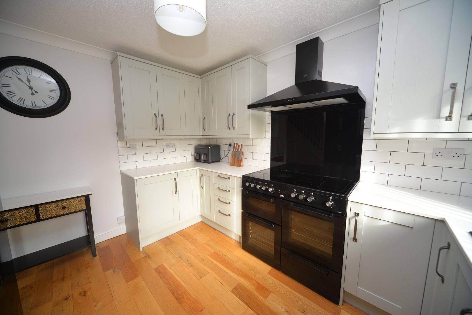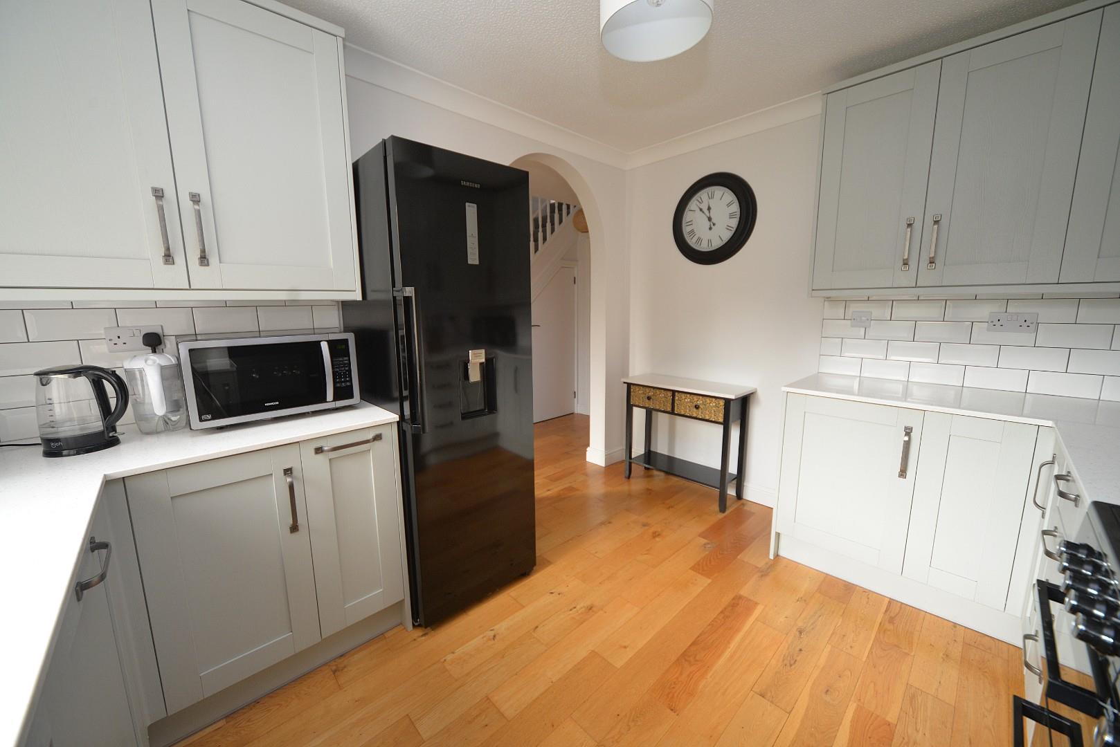 3.48m x 2.84m (11'5" x 9'3" ) - This attractively fitted kitchen has a good range of base cupboards, drawers and wall mounted cabinets, worktops incorporate a contemporary black sink with matching mixer taps, there is space for a range cooker, space for fridge freezer and an integrated dishwasher, a window looks out over the front garden, there is a ceiling light point, coving to ceiling and oak flooring which continues through into the hallway.