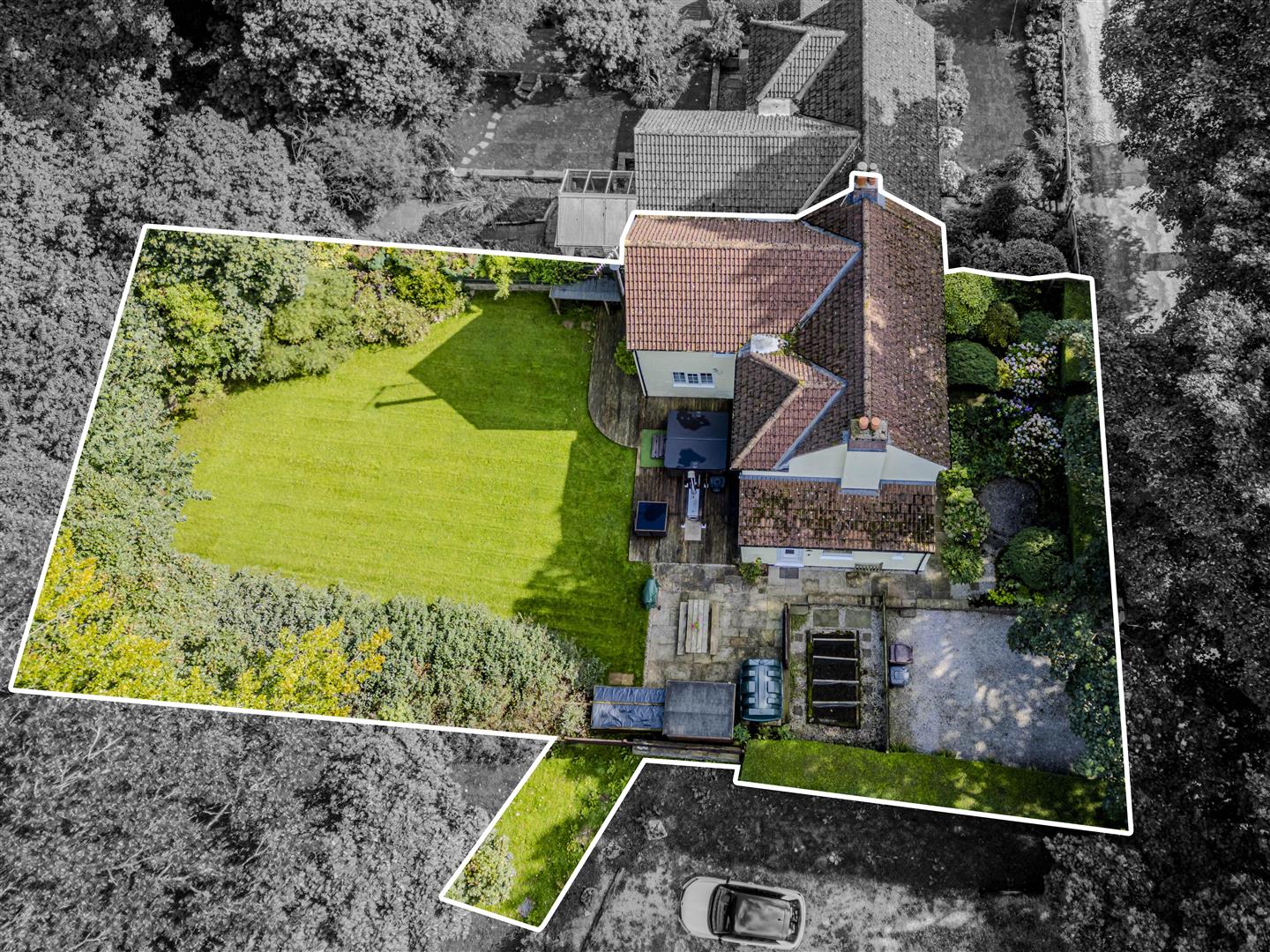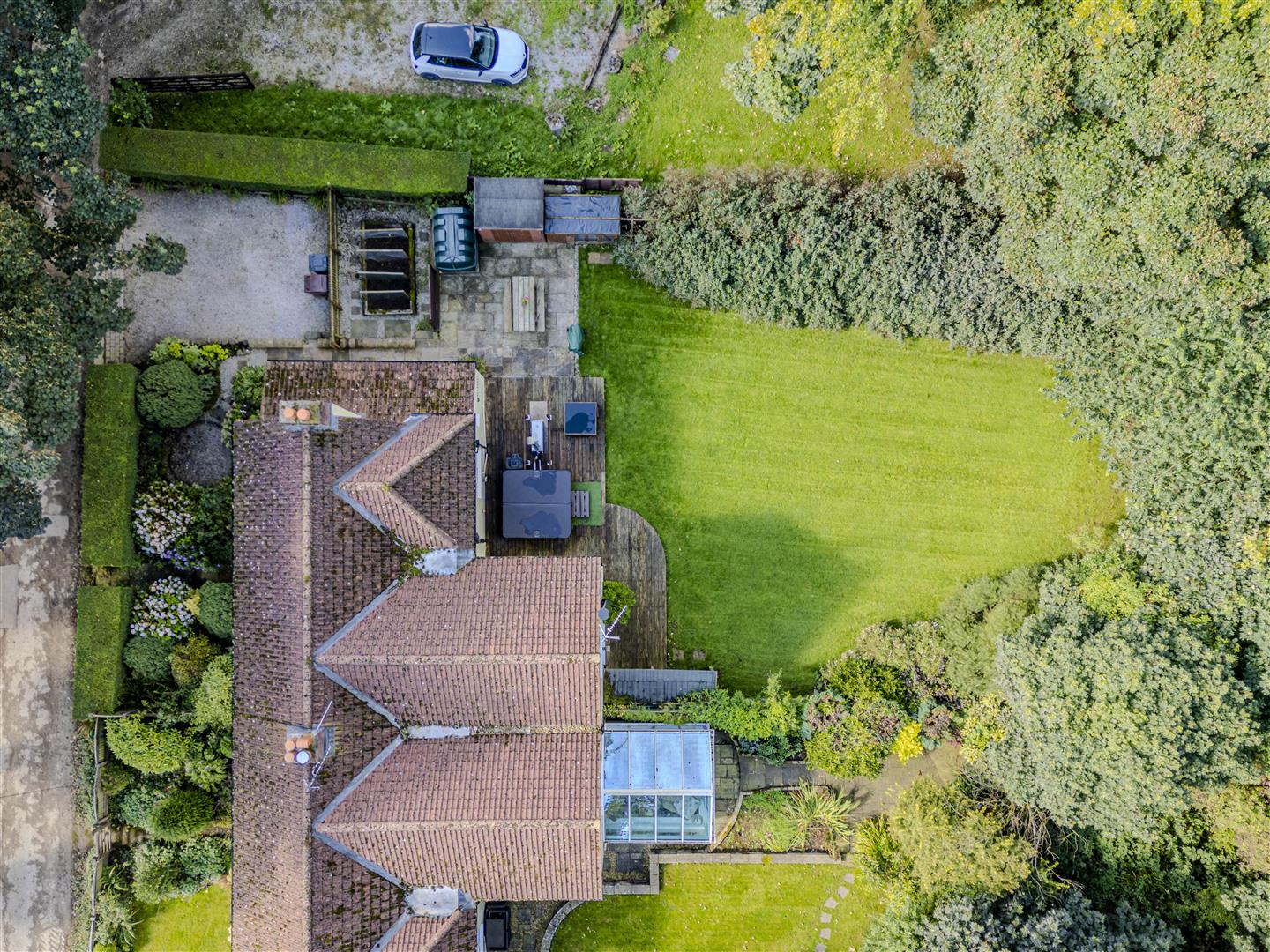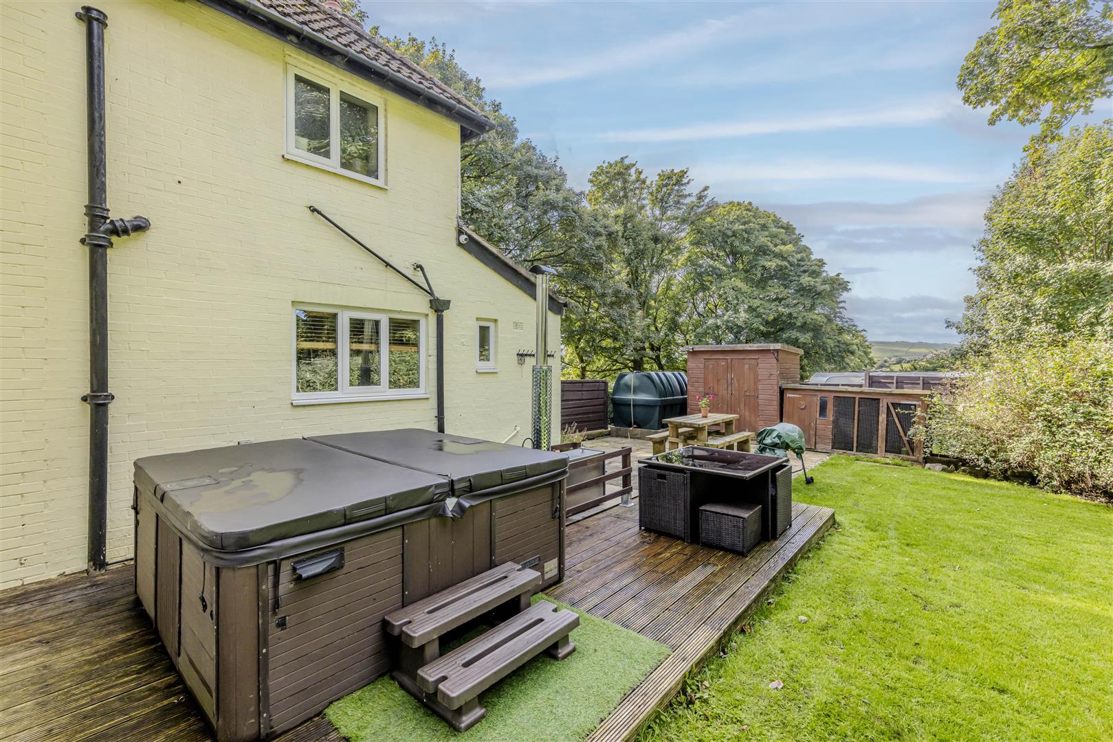 Set within an expansive plot, this property features ample off-road parking via the driveway and a stunning country-style garden at the front, adorned with a variety of flowers and shrubs enclosed by neat hedging. A pathway leads from the front to the rear garden, which boasts a vegetable bed, patio seating area, raised decking, and a meticulously maintained lawn, all enclosed with hedging, fencing, and stone dry walling. The garden backs onto fields, providing a serene retreat, perfect for keen gardeners or families alike.