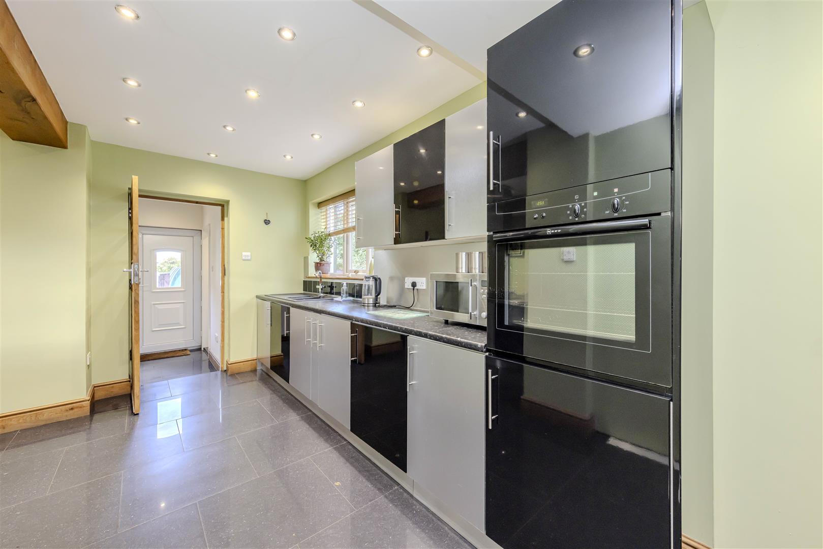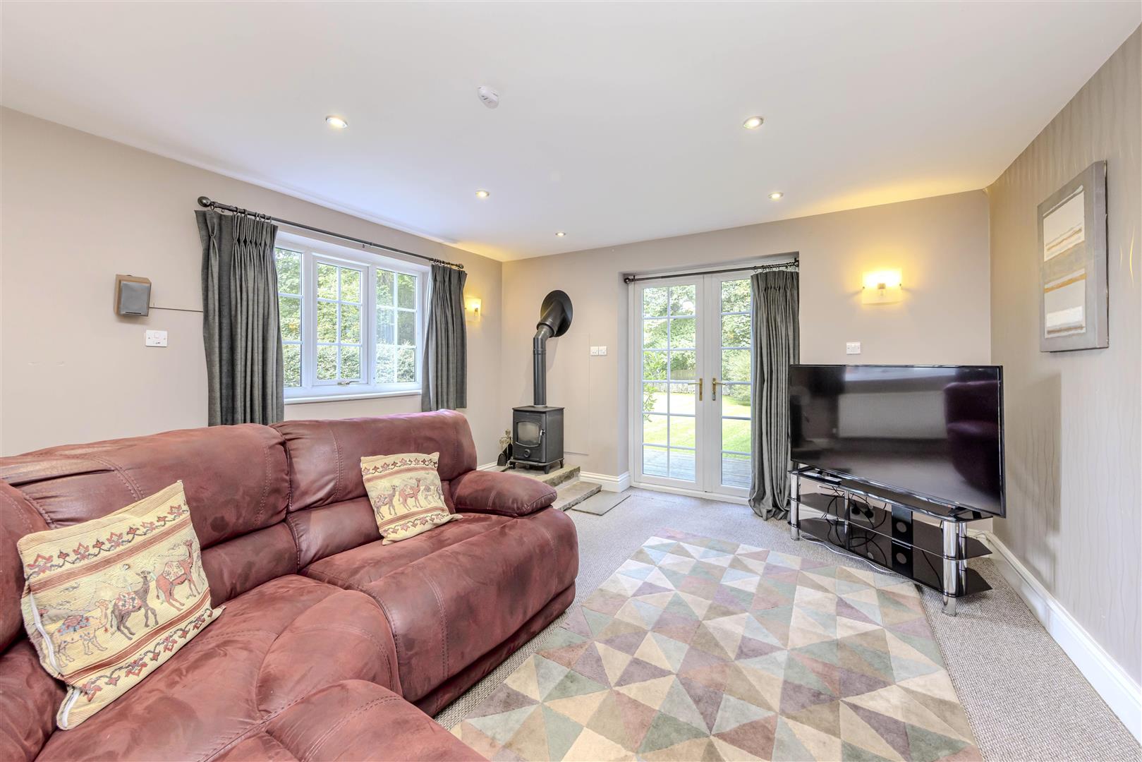 Upon entering this pristine residence, you are welcomed by a spacious entrance hall that leads to two generous reception rooms. The first reception room boasts a multi-fuel stove set on a stone hearth, providing a warm and inviting atmosphere. French doors grant direct access to the stunning rear garden, allowing for seamless indoor-outdoor living. The room is illuminated by modern inset spotlighting, enhancing its contemporary feel. The second reception room, currently utilised as a dining area, features exposed beams and a multi-fuel stove, offering a characterful space with views over the front cottage-style garden. Double doors connect this room to the main lounge, creating an ideal setting for entertaining family and friends.