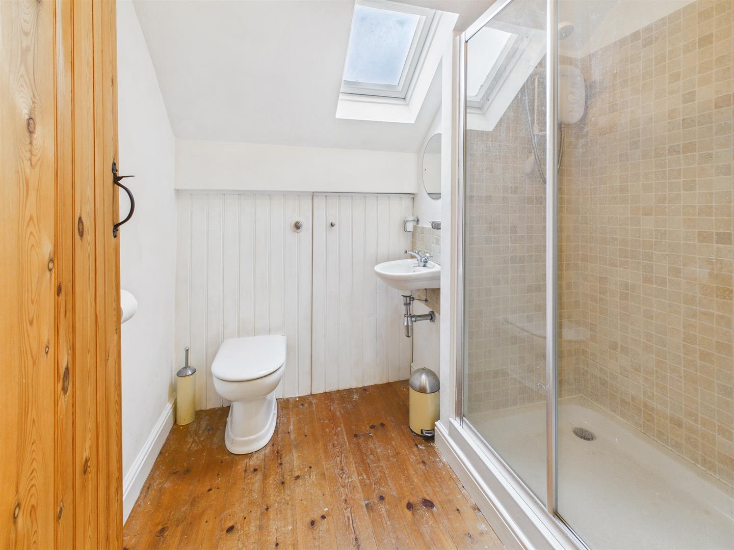 Shower Room - 2.18m x 1.91m (7'2" x 6'3") - With a fully tiled and glazed shower cubicle and shower, wall mounted wash hand basin and low-level W.C. With stripped wooden flooring, Velux sealed unit double glazed loft window, extractor fan and heated towel rail.