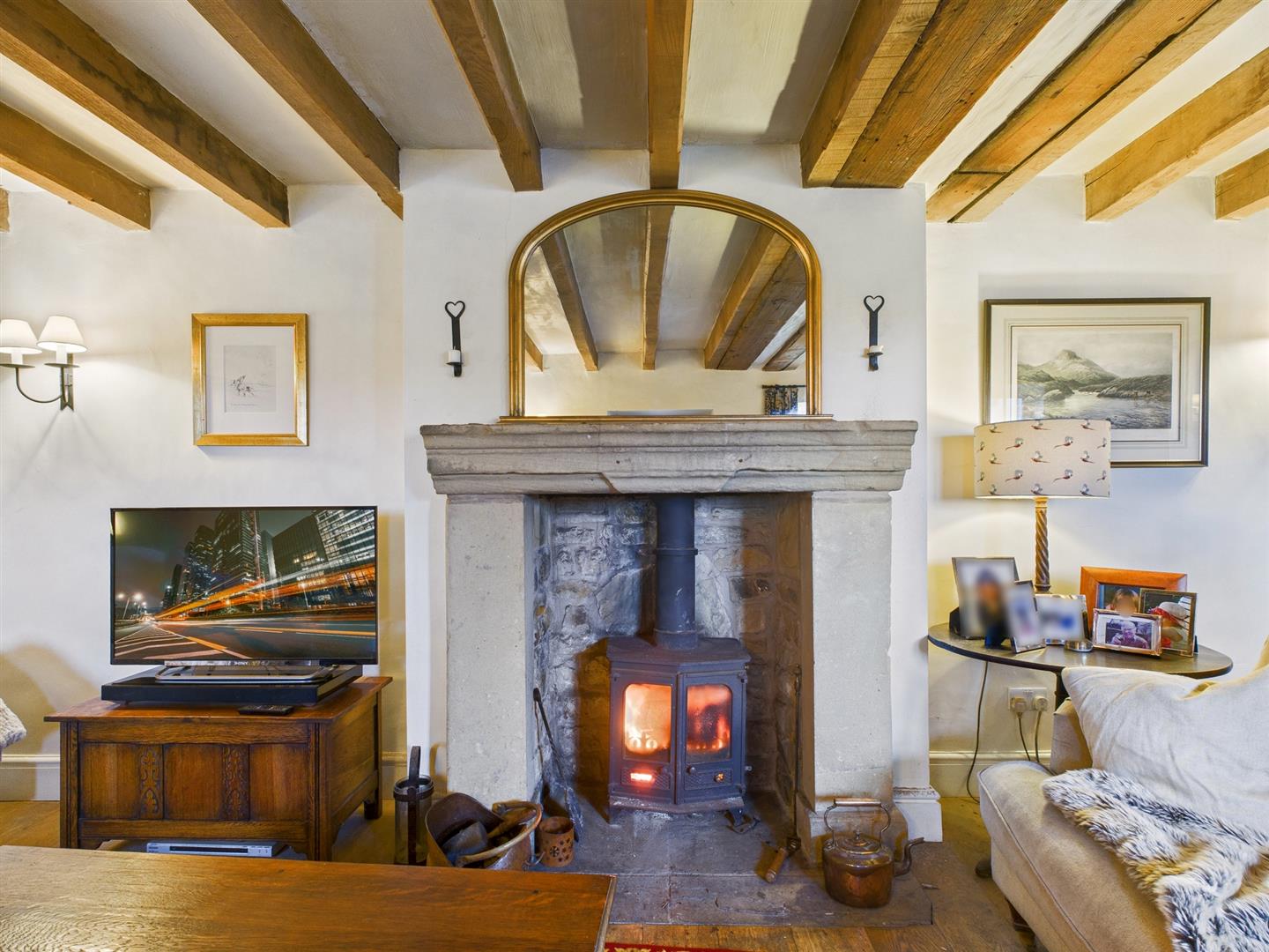 Lounge - 4.78m x 3.63m (15'8" x 11'11") - With solid oak flooring and oak ceilng beams, feature decorative fireplace surround and mantel over with recessed fireplace incorporating a cast iron multi-fuel stove. With four wall-light points and three windows to the front. Door to outside. With wall mounted shelving.