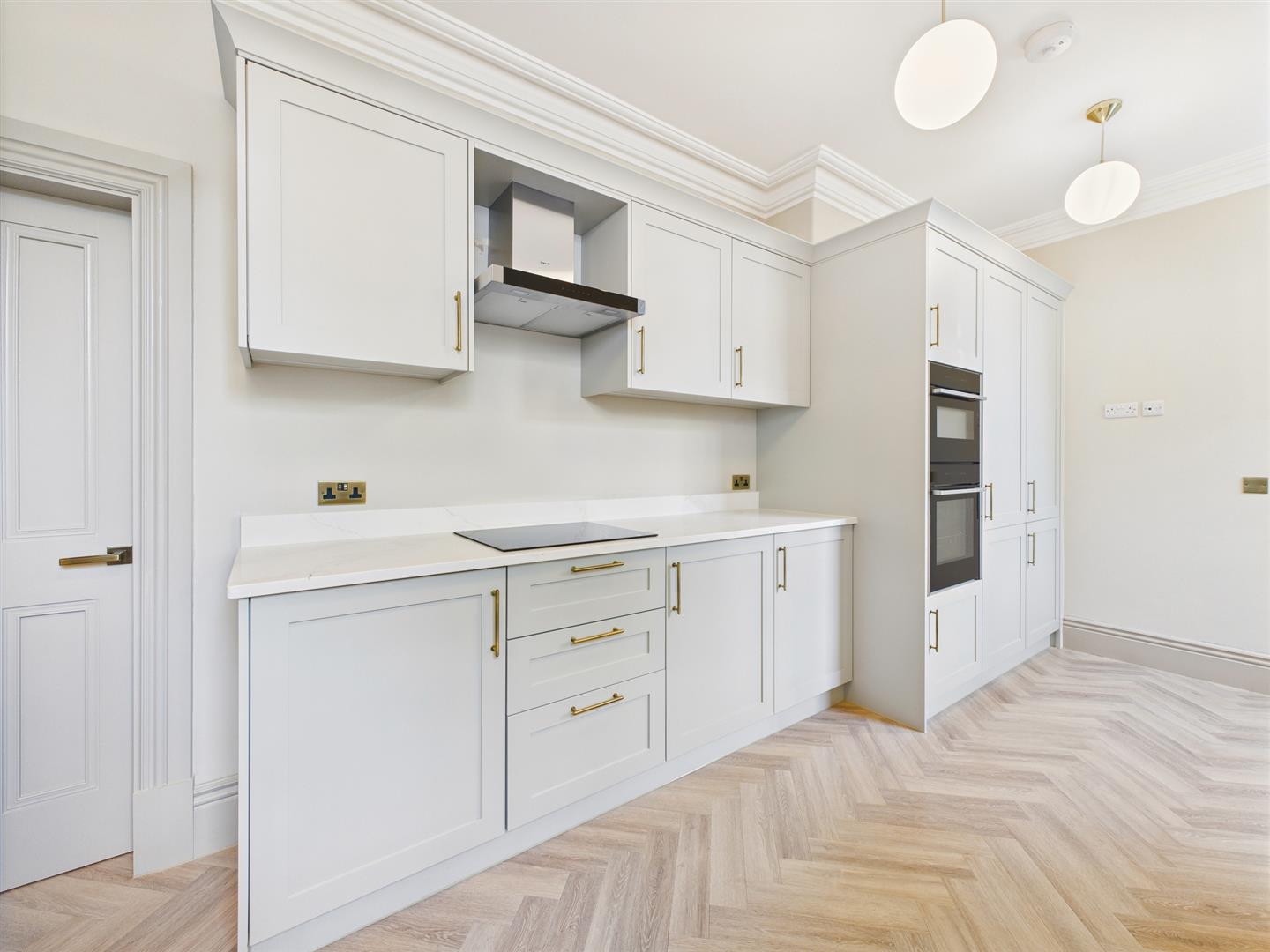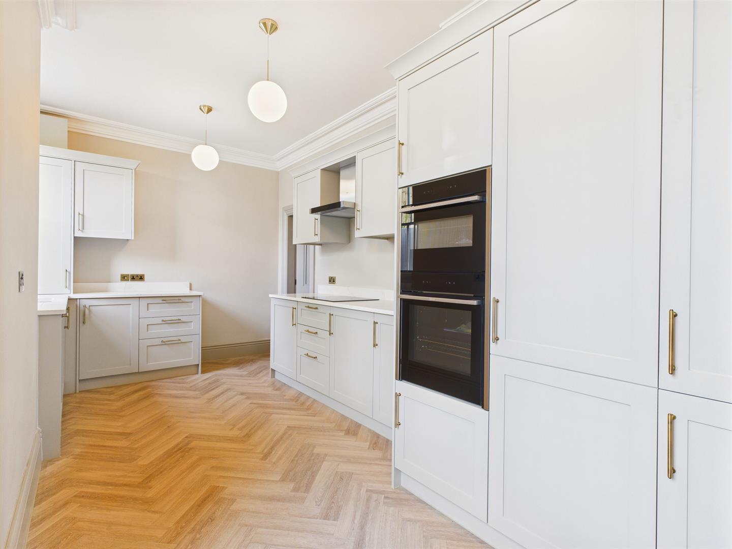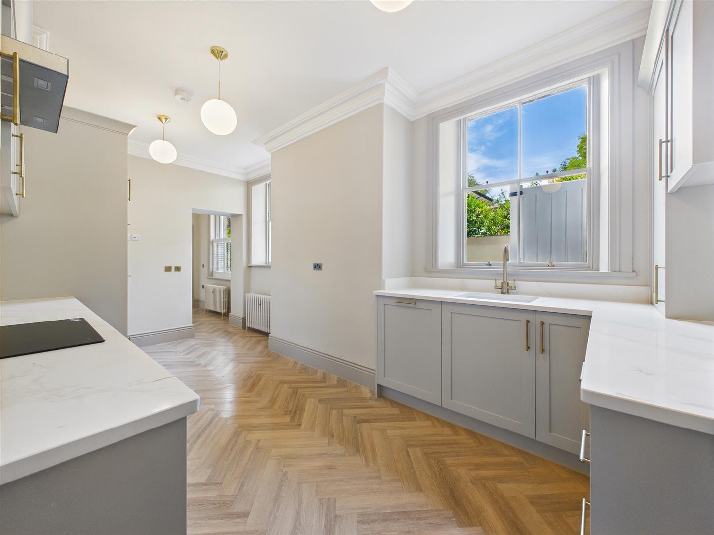 Dining Kitchen - Fitted with a range of base and wall mounted cupboards with quartz work surfaces. Integrated appliances, sink unit with mixer tap, wood effect flooring, two sash windows and original style radiator.