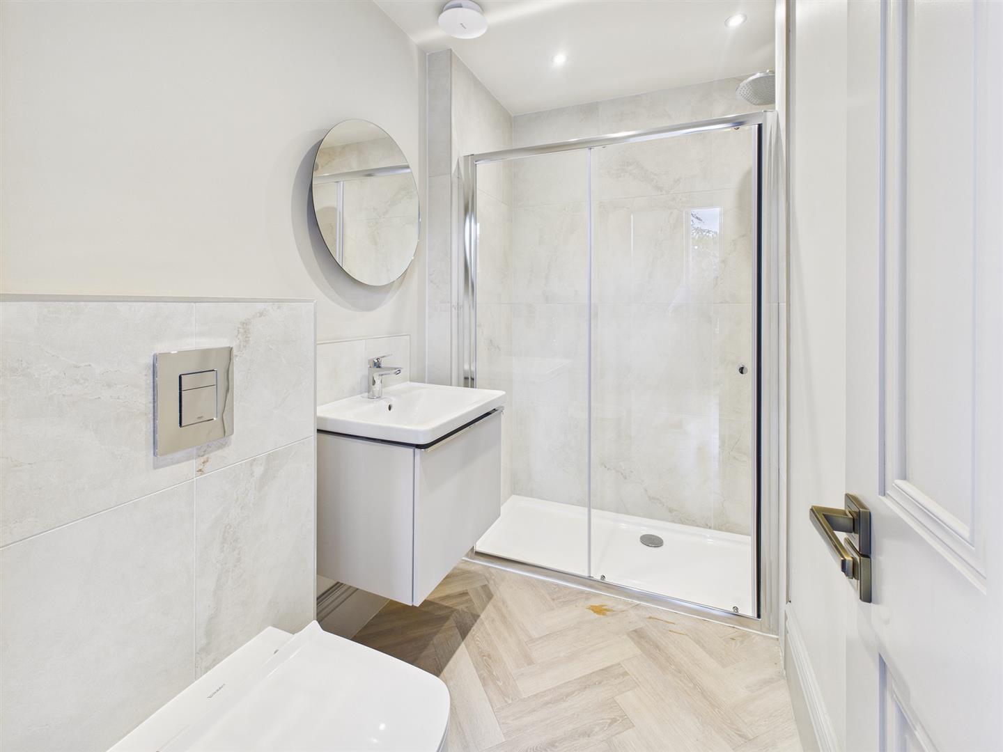 En Suite Shower Room - Fitted with a quality suite comprising low level wc and wash basin and a tiled and glazed cubicle with shower. Wood effect flooring and extractor.