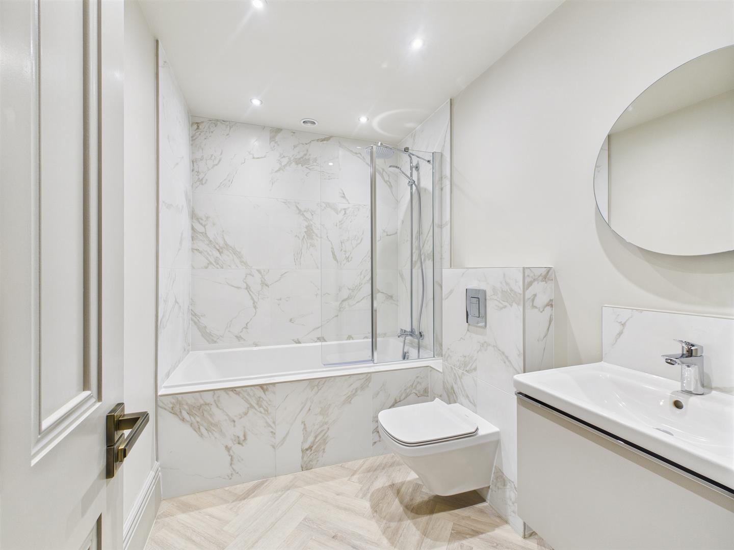 Bathroom - With part tiled walls and fitted with a white suite comprising panel bath with shower screen and shower over, vanity wash basin and low level wc. Wood effect flooring