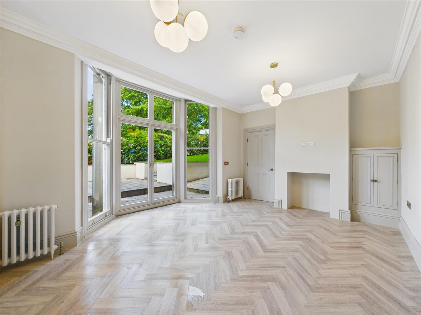 Lounge - Ceiling coving, wood effect flooring, built in cupboard and two original style radiators. Bay to side with sash windows and glazed doors to the side.