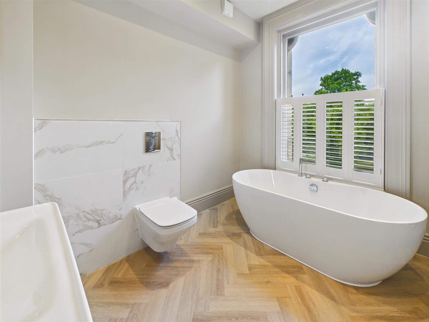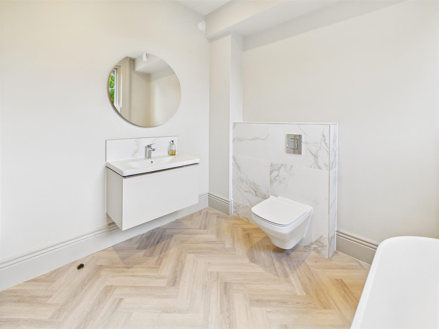 En Suite Bathroom - Fitted with a quality suite comprising a free standing bath with shower attachment, wall mounted vanity wash basin and low level wc. Sash window, wood effect flooring and extractor.