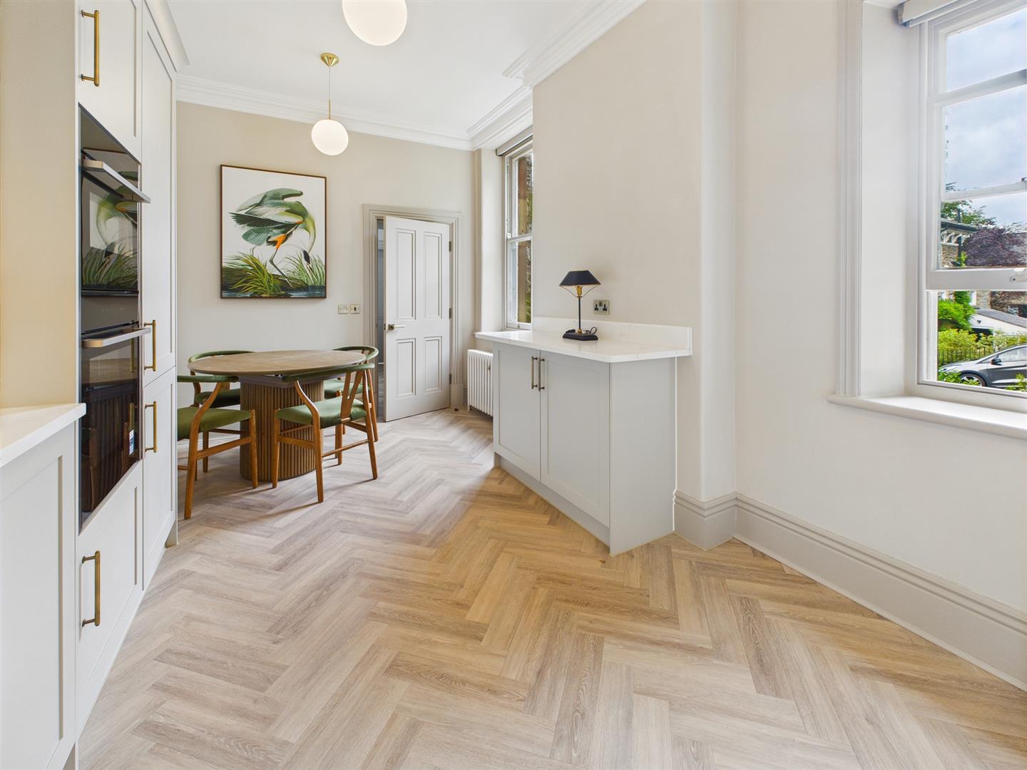 Dining Kitchen - Fitted with a quality range of base and wall mounted cupboards with quartz work surfaces incorporating a sink unit with mixer tap. Under lighting, wood effect flooring, ceiling coving and original style radiator. Integrated appliances including fridge/freezer, dishwasher, oven, combination microwave oven, ceramic hob and extractor. Two sash windows to side.