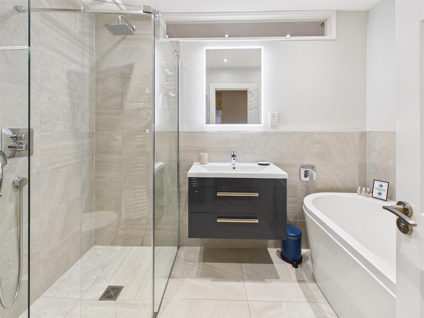 En-Suite Bathroom - 2.77m x 1.88m (9'1" x 6'2") - Fitted with an excellent quality suite comprising an oval freestanding bath, fully tiled and glazed walk-in shower cubicle and rainfall shower and wall mounted vanity washbasin. Extractor fan, stainless steel heated towel rail, underfloor heating and half tiled walls.