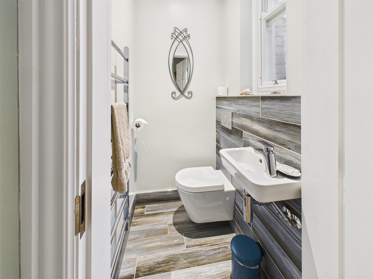 Cloakroom - 1.14m x 0.94m (3'9" x 3'1") - With low-level w.c., wall mounted washbasin, extractor fan, stainless steel heated towel rail and frosted sash window.