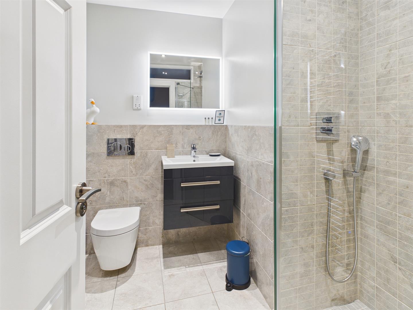 En-Suite Shower Room - 1.98m x 1.42m (6'6" x 4'8") - With a fully tiled and glazed walk-in shower cubicle and rainfall shower, low-level w,c. and wall mounted washbasin. Extractor fan, stainless steel heated towel rail, underfloor heating and half tiled walls.