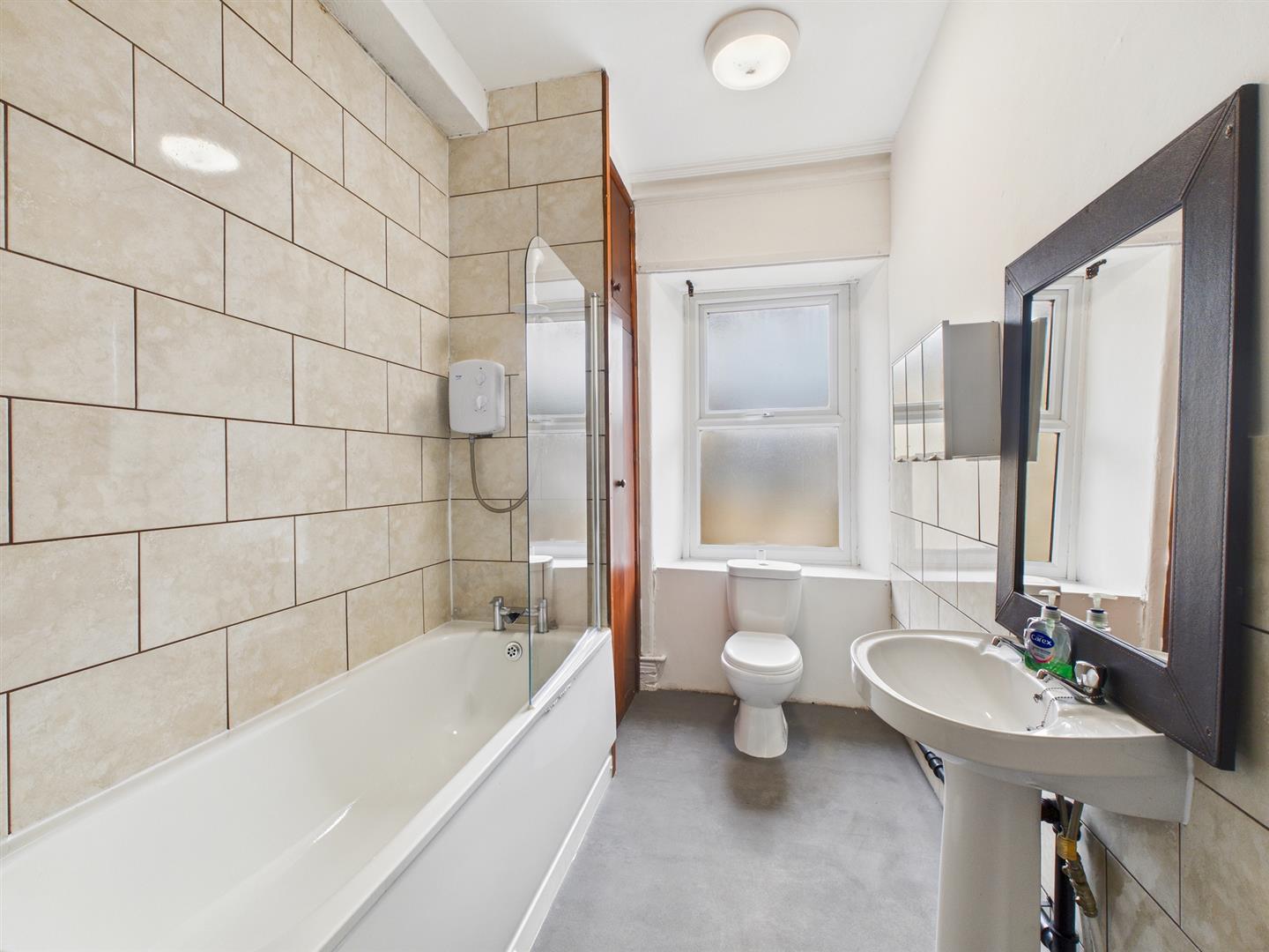 Bathroom - 3.53m x 1.88m (11'7" x 6'2") - Fitted with a good quality suite comprising a panelled bath with electric shower over and shower screen, pedestal washbasin and low-level W.C. Stainless steel heated towel rail, frosted uPVC sealed unit double glazed window and part tiled.
