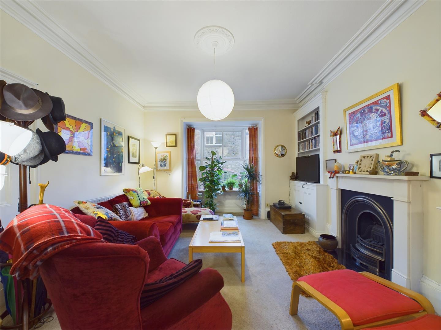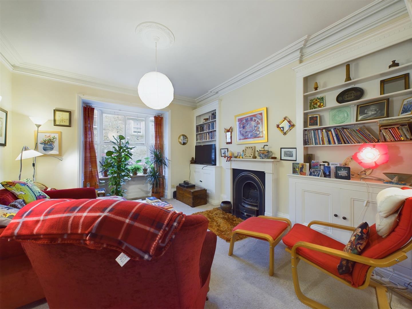 Lounge - 5.05m into bay x 3.78m (16'7" into bay x 12'5") - With a decorative wooden fireplace surround incorporating a cast iron fireplace with coal effect living flame electric fire. With built-in storage cupboards, wall mounted shelving, single radiator, decorative ceiling cornice and sealed unit double glazed bay window to front.