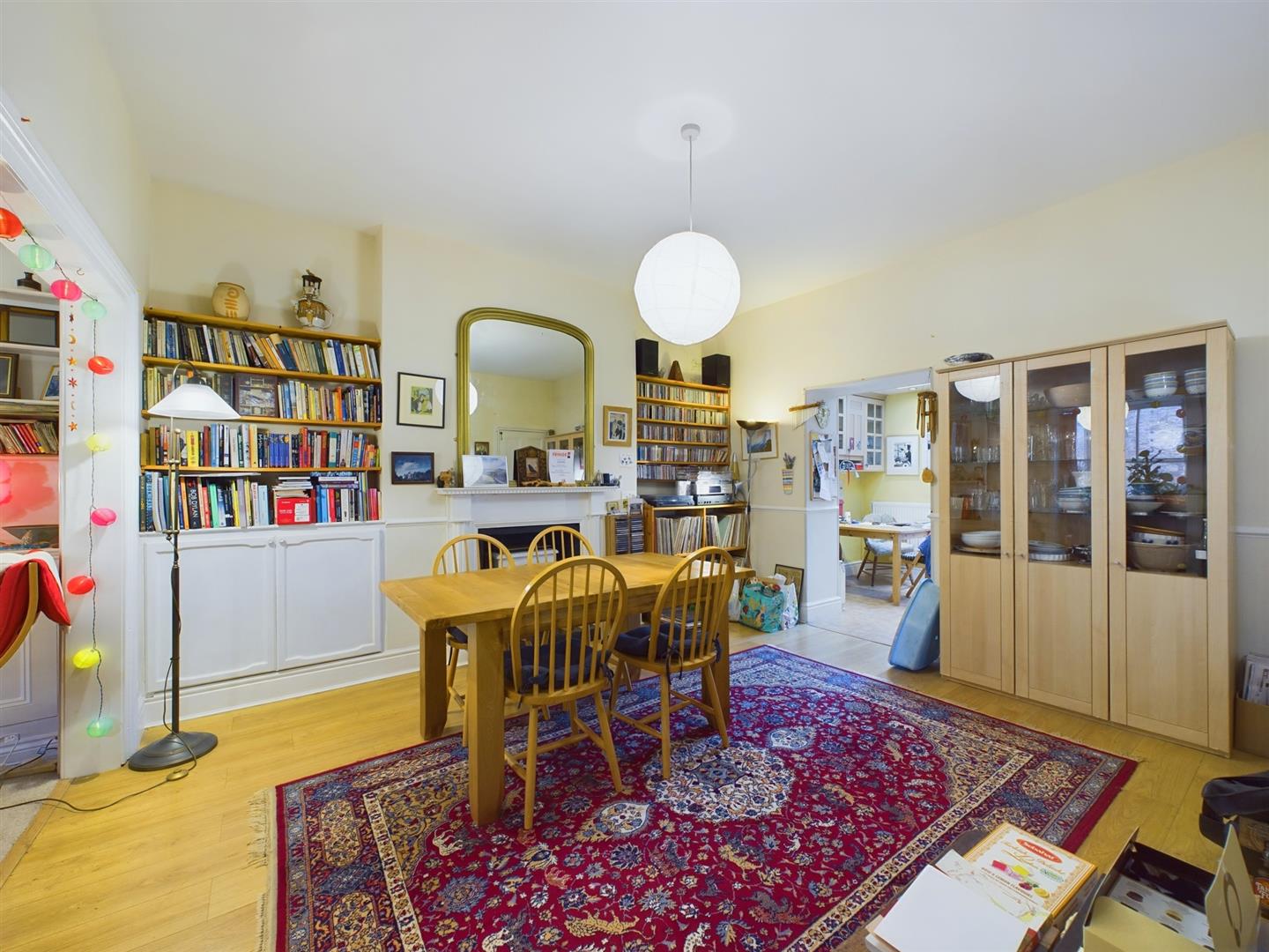 Dining Room - 4.27m x 3.89m (14'0" x 12'9") - With wood effect laminate flooring, built-in storage cupboards and wall mounted shelving. Feature decorative wooden fireplace surround with recess fireplace containing electric stove. Open plan through into the lounge and door to cellars.