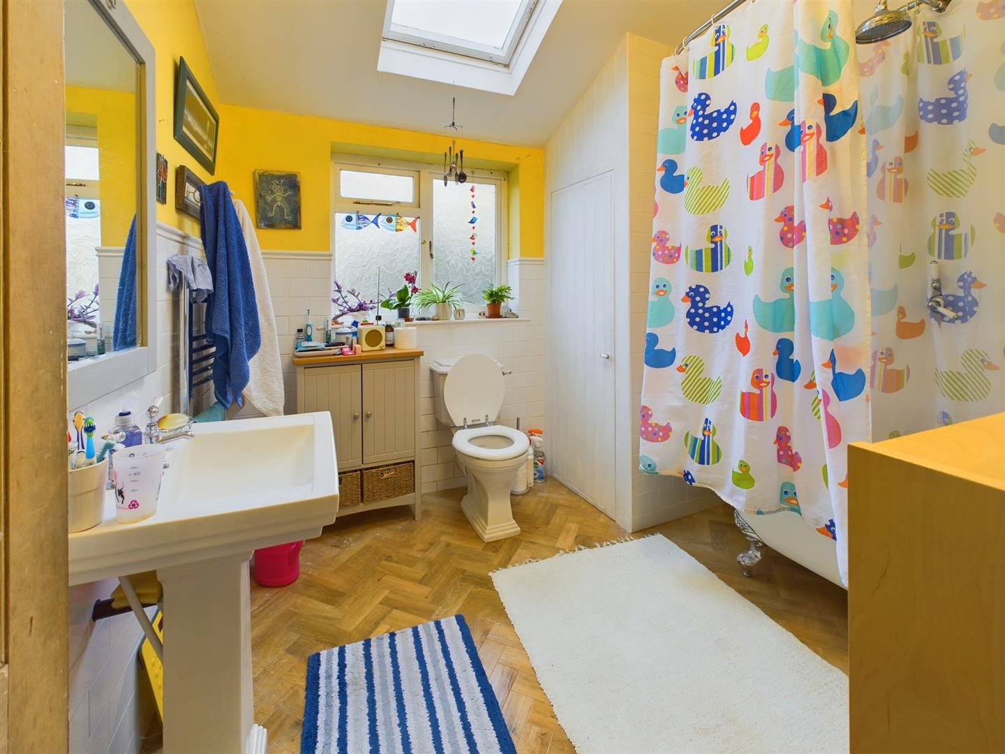 Bathroom - 2.64m x 2.62m (8'8" x 8'7") - Fitted with an excellent quality suite featuring a claw foot bath with rainfall shower over and shower curtain, low-level wc and pedestal washbasin. Frosted sealed unit double glazed window, Velux sealed unit double glazed loft window, stainless steel heated towel rail and half tiled. Wall mounted cupboard housing a Vaillant gas combi centrall heating and hot water boiler.